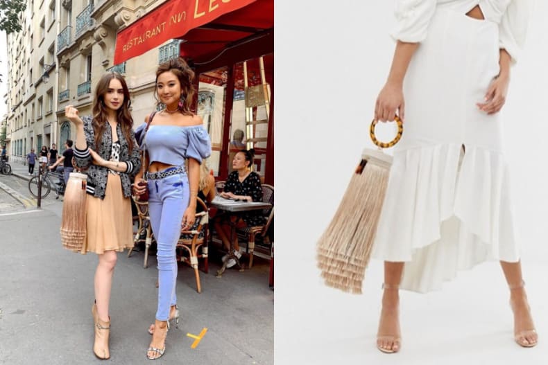 虽然Lily Collins的角色在巴黎时尚圈行销公司工作,但是她也像一般普通女生一样,也会网购。这款流苏小包就是网购平台ASOS推出的包款。香槟色的流苏小包,在视觉上非常吸睛,甚至还能当晚宴包使用。