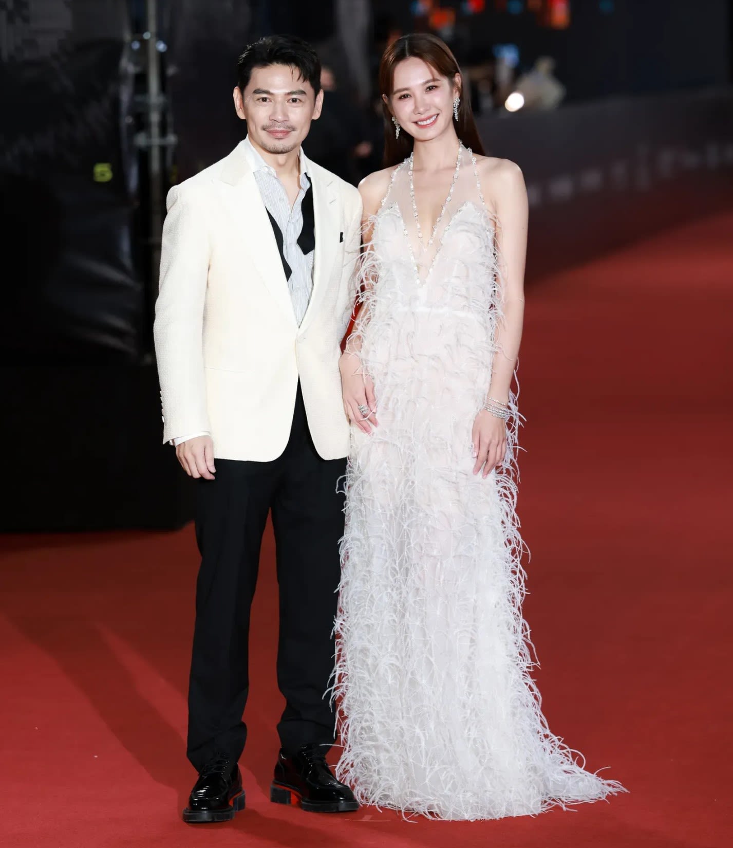 安心亚身穿Rachel Lai一袭缀满白色羽毛的露背晚礼服,在行走间羽毛飘逸舞动,营造柔美高级的气质;而阿Ken则以一身Dunhill白色西装与女伴相呼应,搭配Christian Louboutin Our Georges皮鞋。