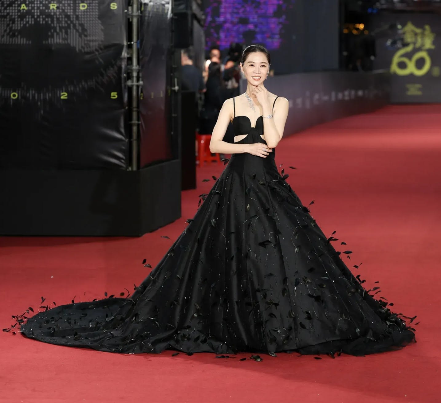 影后红毯上气场全开!谢盈萱一登上红毯便成全场焦点,梳着典雅包头,身穿一袭菲律宾婚纱品牌MARK BUMGARNER全黑色缎面立体大蓬裙,裙摆点缀细致羽毛随脚步摇曳,整体气质宛如古典戏剧女伶。胸前点缀Chanel顶级珠宝FIL DE COMÈTE彗星项链,配戴Chanel镶钻耳环与戒指。