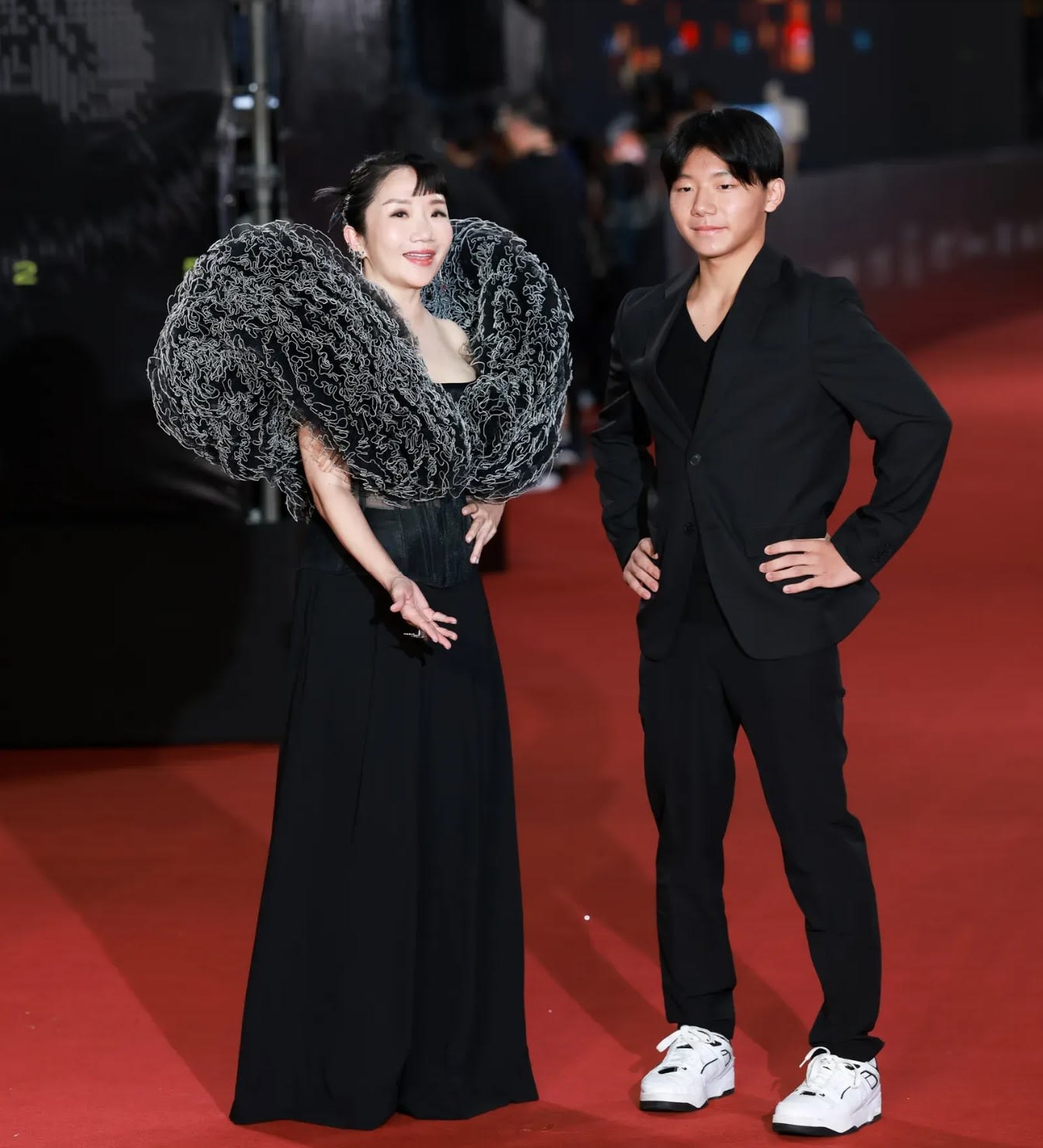 金钟奖“节目类”红毯压轴,由陶晶莹与儿子小龙携手亮相,母子档罕见同框。陶晶莹选穿来自Act N°1的战袍,效果十足的巨大立体肩部装饰以细腻皱折堆叠而成,搭配黑色俐落宽裤,展现陶子不按牌理出牌的风格,首饰则出自Damiani。一旁的小龙则以全黑西装搭配运动鞋,以“训练师”身份陪同妈妈走红毯。