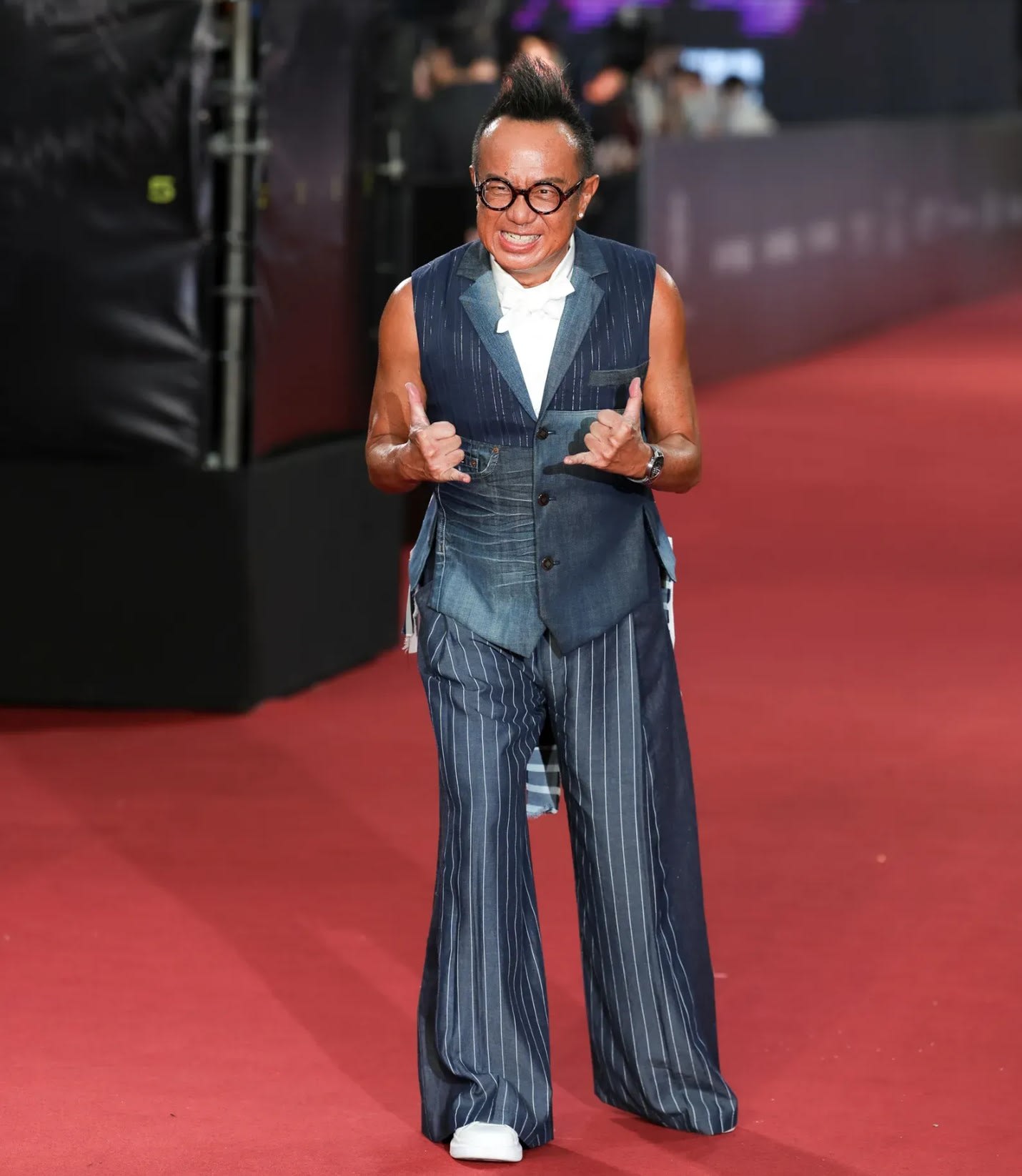 歌手兼《化外之医》演员黄大炜选穿无袖灰蓝背心搭配蓝色直条纹宽裤,脚踩白色球鞋,再以一条白色大蝴蝶结作为领结点缀,风格十分前卫,不愧是“摇滚教父”。