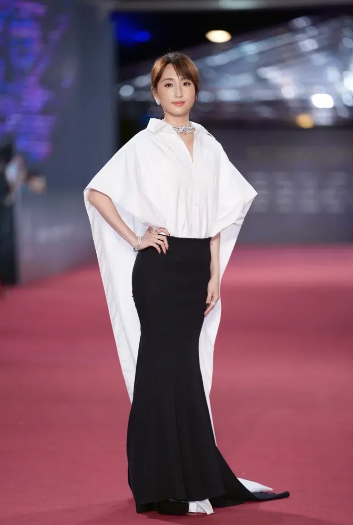 柯佳嬿服装相当独特,上半部分采用了白色光泽材质,呈现出如同雕塑般的立体感,肩部的设计宽大而流线,背后大片拖尾宛如展翅的羽翼,突显出自信与气场,下半身则是黑色鱼尾剪裁的长裙,裙摆自然垂坠并延伸至地面,流畅的线条展现出高贵典雅的气质。她造型还以BVLGARI珠宝缀饰。
