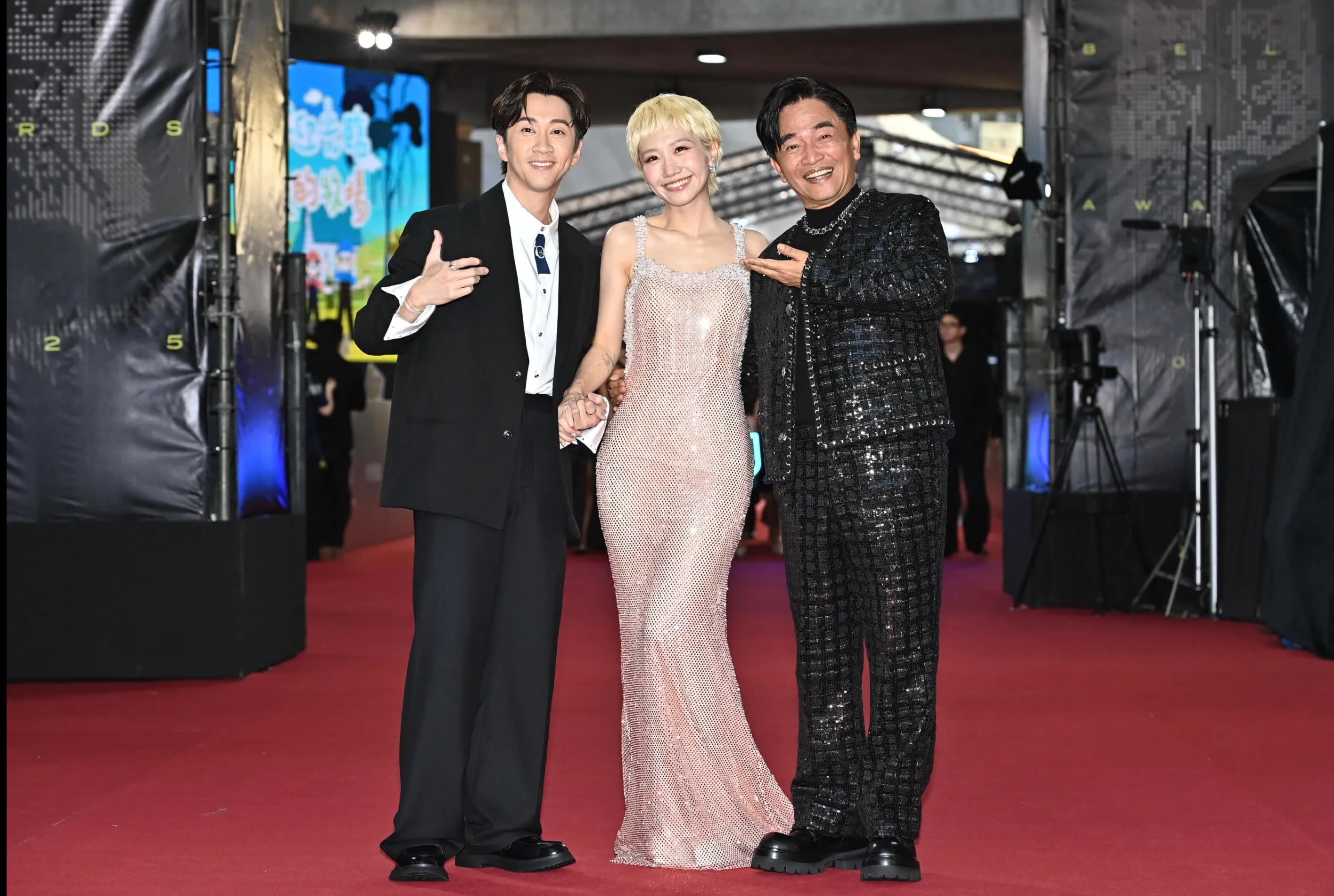Lulu首次和老公陈汉典公开亮相,男方选择SHIATZY CHEN 2025秋冬oversize羊毛西装与松身裤装,搭配饰有荷叶袖口的衬衫与亮面领巾,首饰则来自Tiffany & Co.珠宝。吴宗宪则以黑色亮片格纹套装登场,色系低调却依旧闪耀,十足展示综艺天王气场。
