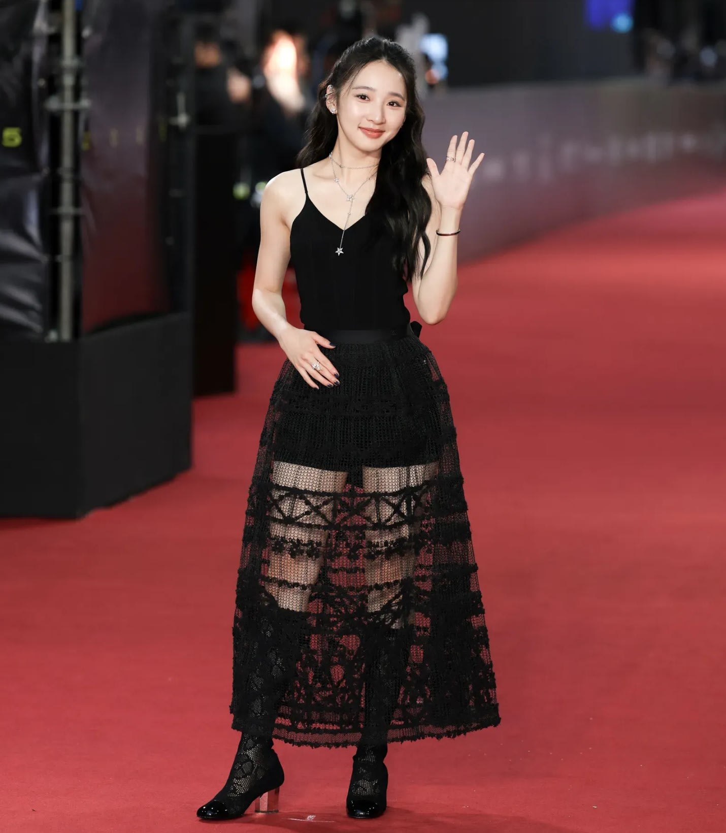 曾夺下金钟奖最佳新人奖的李沐,今晚穿了Chanel 2025春夏系列黑色嫘萦细肩带上衣与蕾丝透肤长裙,搭配Chanel蕾丝高跟长靴,点缀高级珠宝LES INFINIS DE COMÈTE镶嵌钻石的长项链、COMÈTE 1932耳扣与COCO CRUSH单边镶钻耳环。