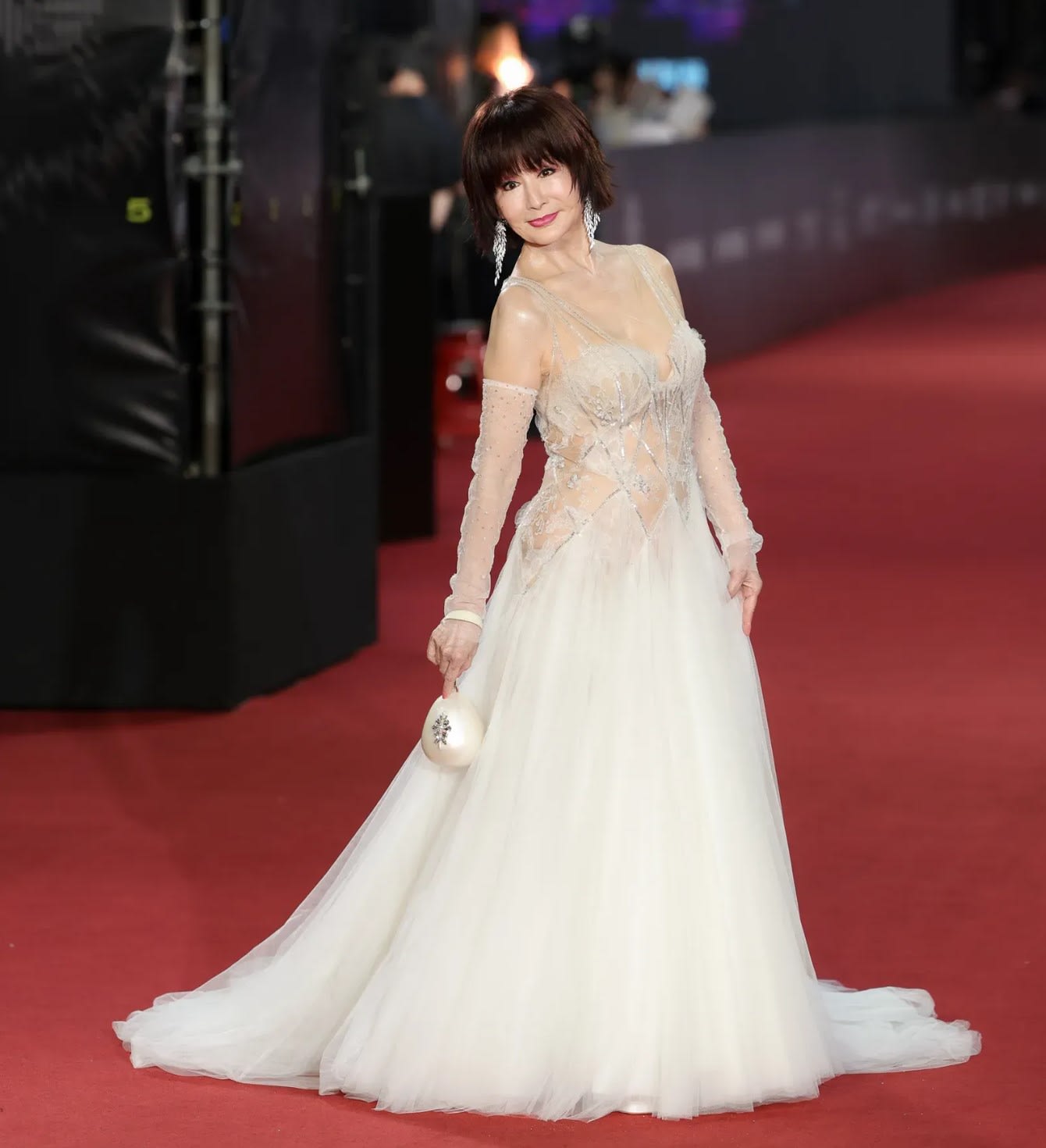 76岁”一代女皇”潘迎紫身穿一袭雪白色透肤雪纺长礼服亮相金钟红毯,细致的珠绣勾勒出立体剪裁,胸前马甲更饰以细腻蕾丝,其梦幻典雅气质数十年如一日,手提着Simone Rocha珍珠手拿包。