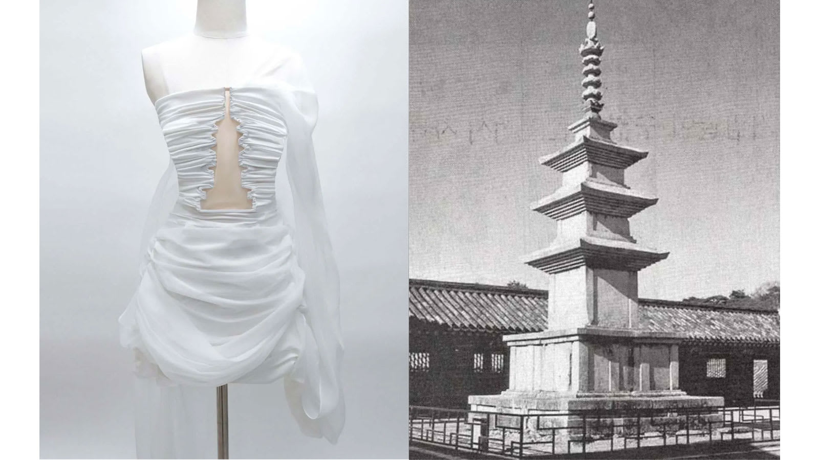 设计灵感来自佛国寺石塔的几何美学与平衡感,透过立体垂坠与镂空剪裁,营造既具张力又优雅的廓形。