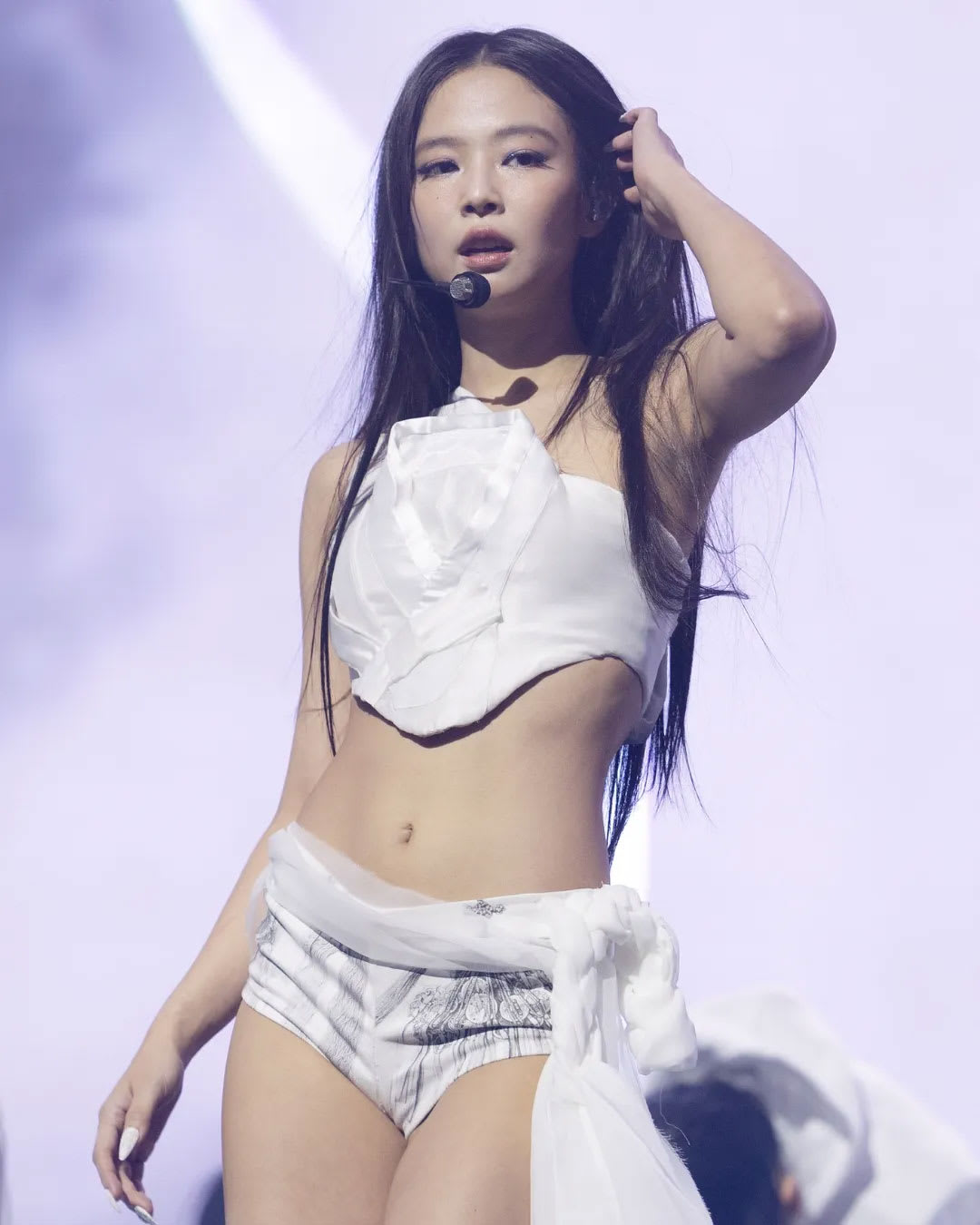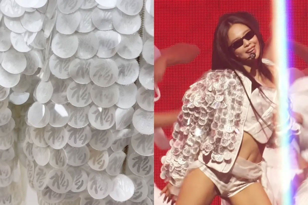 Leje 巧妙将韩国服饰中经典的 “薄纱”(시배) 元素贯穿全场。在“Zen”、“Like Jennie”段落,设计团队把传统韩服的 “衣领”(동정)与 “系带”(고름) 转化为西式马甲结构,塑造出柔中带刚的身体曲线。下半身则以喷绘技术,勾勒银妆刀等传统工艺图腾,展现极致手工艺细节。