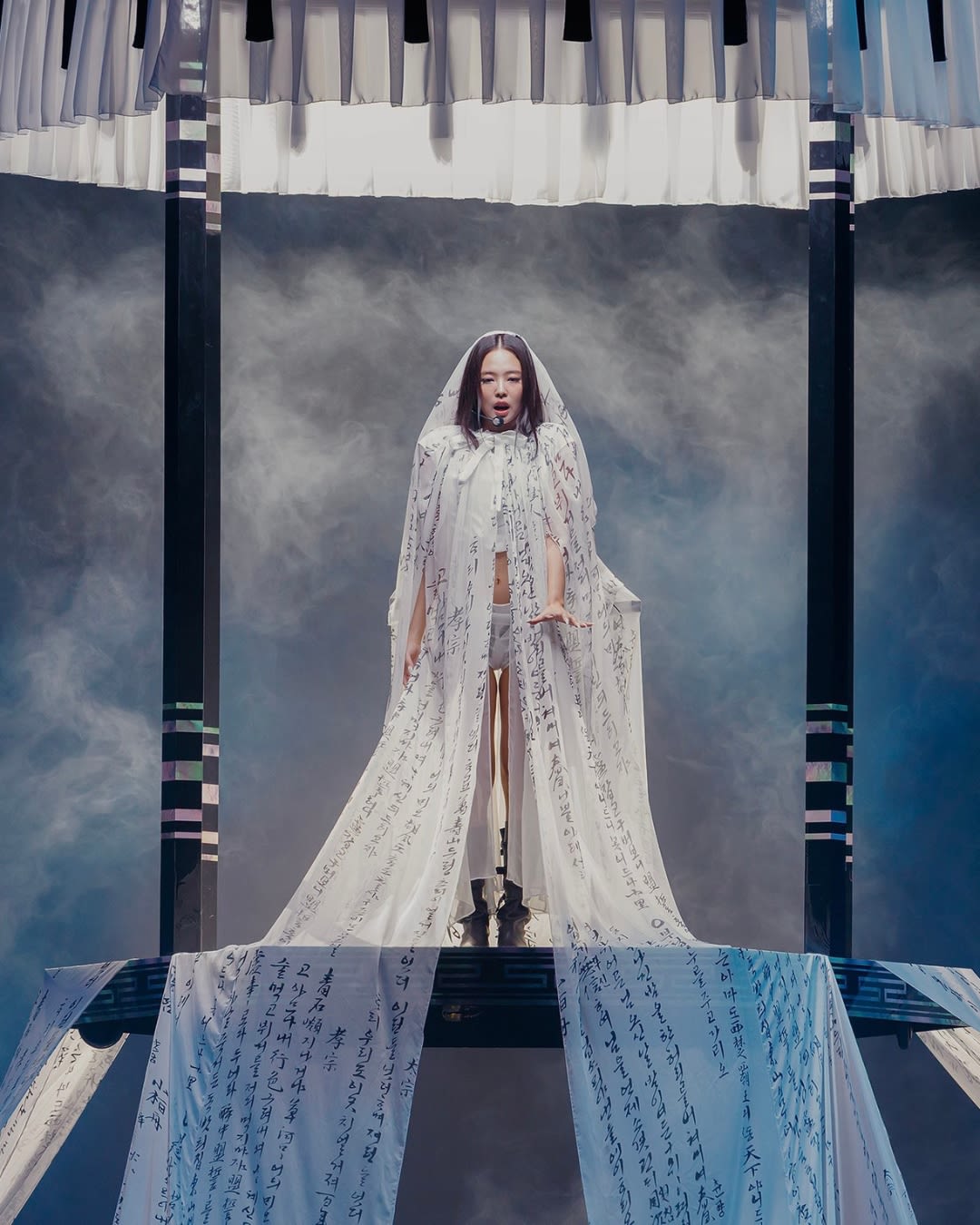 这层薄纱宛如一道穿越时空的帘幕,连结了流行舞台与文学传统,也轻盈托出她身为韩国歌手的文化原点。