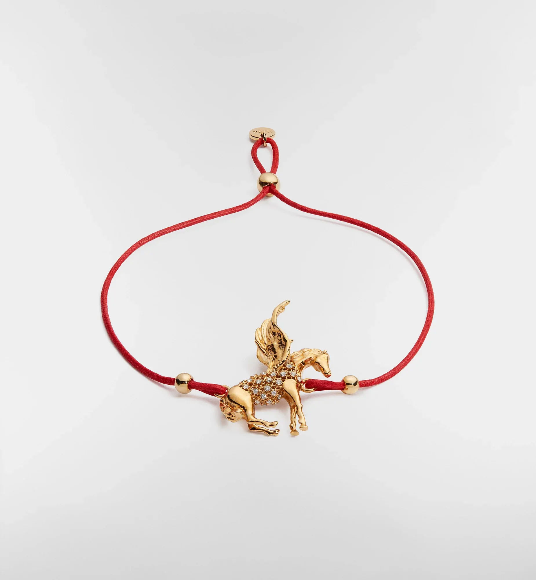 Dior这款Diorelita手链走的是精致现代风。红色棉绳上挂着一只金色金属打造的天马,天马身上还镶满闪耀的水晶,细节精致到不行。天马本身就有幸运与守护的寓意,纤细的设计单戴温柔、叠搭也很有层次感,任何场合都能驾驭。