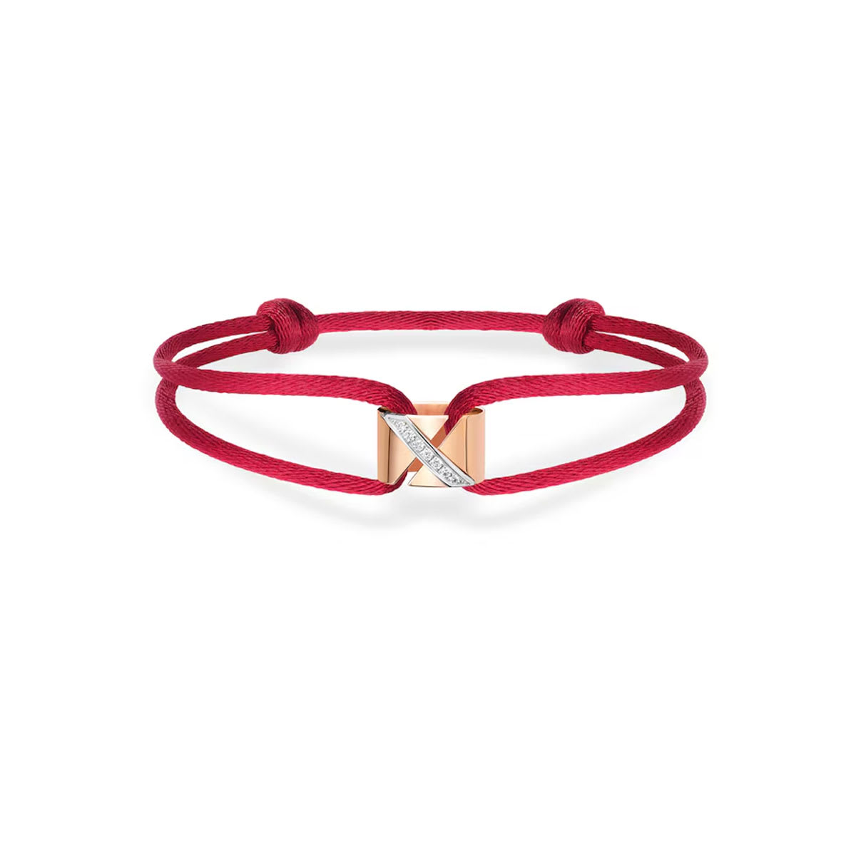 Chaumet的Liens系列,向来不急着说爱,而是用“连结”本身去描绘关系。Liens Évidence手环以18K玫瑰金与白金构成几何交叉,中央镶嵌7颗钻石,像是一个被光点标记的交会瞬间。它不像戒指那样宣告承诺,更像是一种彼此心照不宣的默契。红色丝绳在这里不是装饰,而是情感的延伸。这是一款需要细看、慢慢感受的手链。