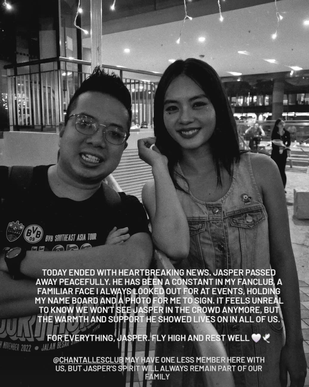 “真让人难以置信,要接受以后再也无法在人群中看到Jasper的事实。他给予我们的温暖与支持,将永远留存在我们每个人心中。谢谢你所做的一切,Jasper。愿你展翅高飞,安息吧🤍🕊️”