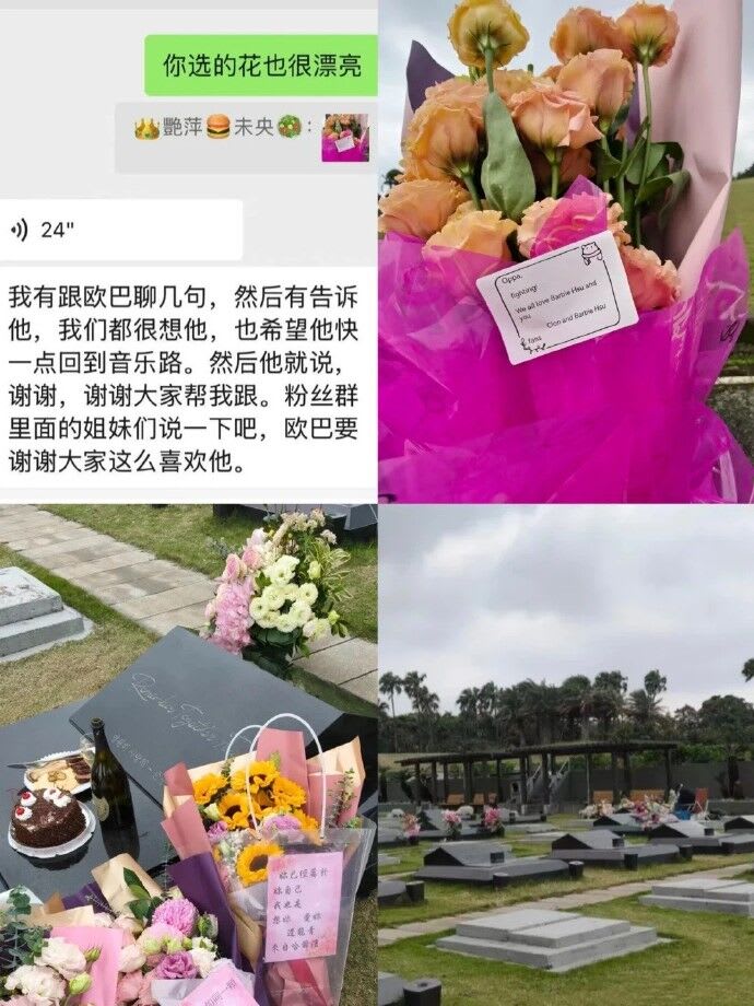 对话截图还附上墓园的照片,黑色大理石墓碑前,摆放了大量的鲜花,除了粉色与白色的玫瑰,更有大束象征温暖与希望的向日葵。墓碑旁可见一个精致的巧克力蛋糕与一瓶酒。