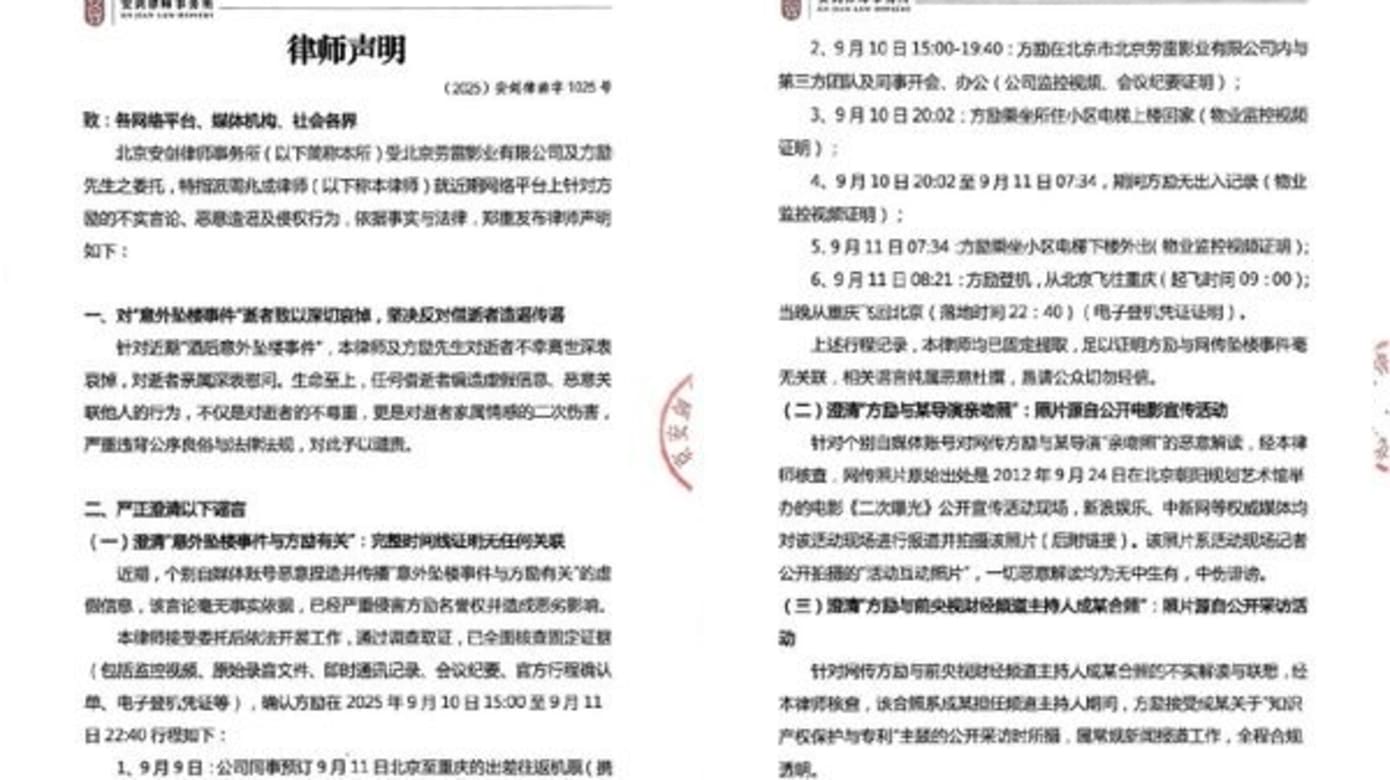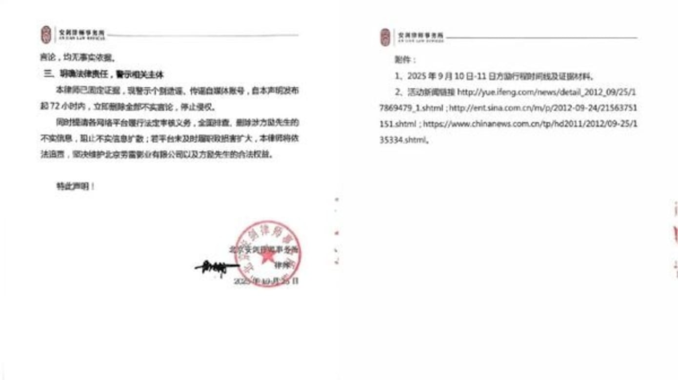 方励的律师声明中,指出部分自媒体帐号“恶意捏造虚假讯息,严重侵犯方励名誉权”,强调方励与该事件“毫无任何关联”。