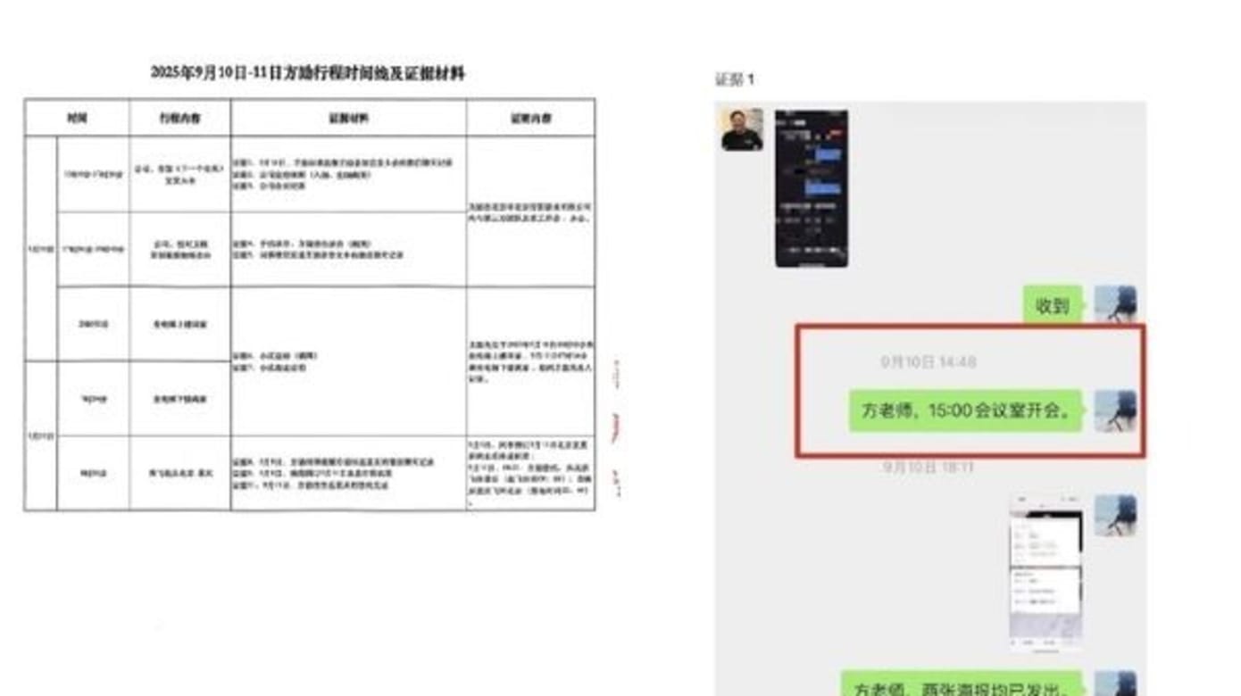 内容指出,方励于9月10日3pm至7.40pm均在北京公司开会与办公,当晚8.02pm回到社区住处后,便无出入记录,隔日7.34am离家前往机场,8.21am登机飞往重庆,并于当晚10.40pm返抵北京。