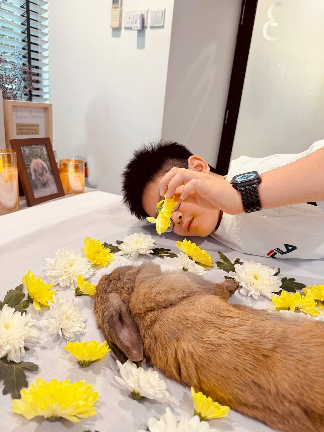 她晒出自己和Simone过往的开心合照,以及儿子Zed和爱兔不舍道别的照片,并和爱兔告别喊话:“现在换Ah Gong 替哥哥照顾你。”范文芳也感性表示:“最小的爪印,却在我们心上留下了最大的印迹。”