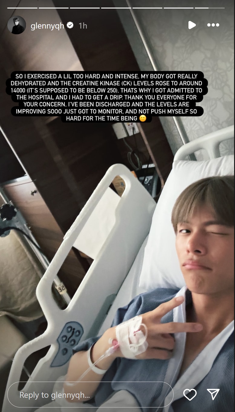 本地艺人容启航今天(9日)透过IG限动透露日前因过度运动导致脱水,并入院吊点滴。他目前已经出院,并向粉丝们报平安。