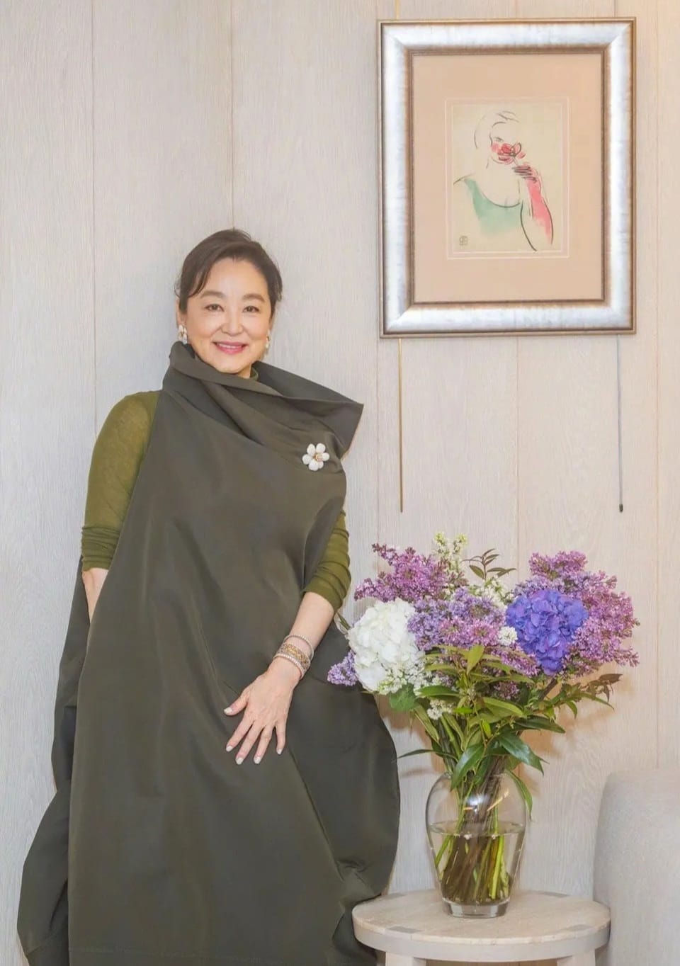 71岁了,化上淡妆的林青霞,面色依然红润。在另一张照片中,她与鲜花合影,绿色披肩配搭白花胸针,优雅高贵……