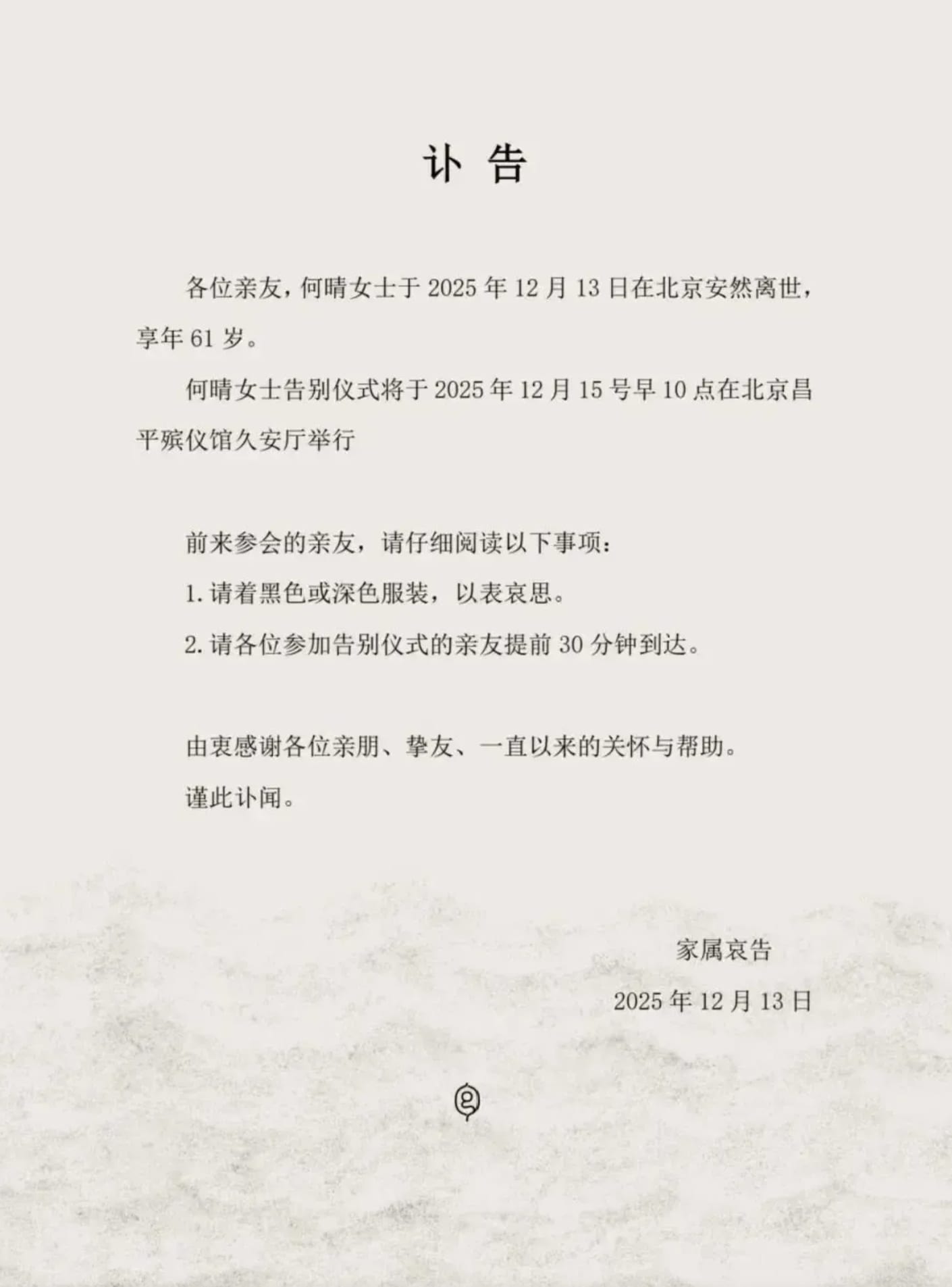 (综合讯)曾演出《青青河边草》并封为“4大琼女郎”的中国女演员何晴,被证实12月13日在北京安然离世,享寿61岁,告别仪式将于明天(15日)在北京一处殡仪馆举行。