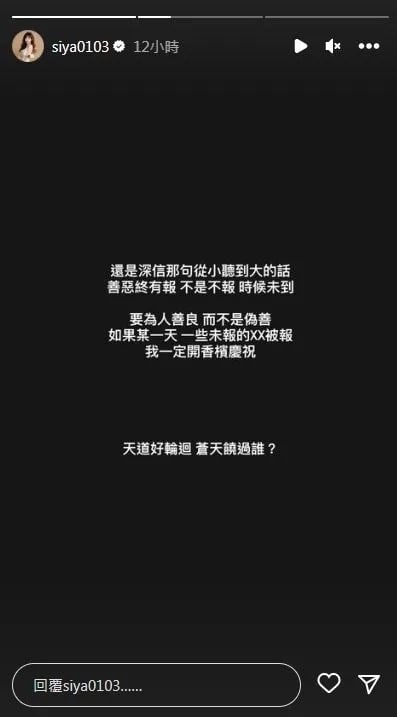 她在IG以全黑图写下68字表示:“还是深信从小听到大的那句话,善恶终有报,不是不报,时候未到,要为人善良,而不是伪善。”这段话也火速引发外界联想,引起热议。