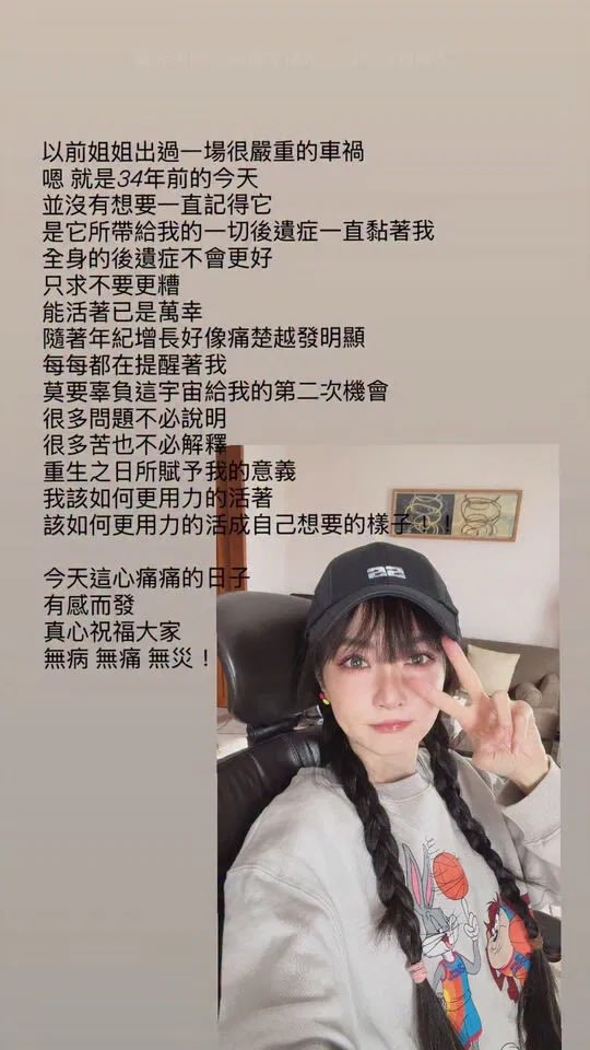 (综合讯)台湾女星谢金燕昨天(21日)在IG发文,提及34年前曾发生一场严重车祸,让她饱受后遗症的困扰,“能活著已是万幸”!