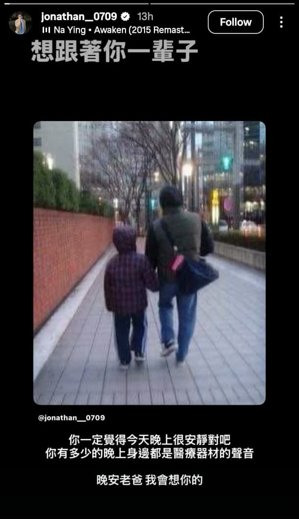 他也在IG限时动态上放上袁惟仁生前所写名曲、那英的《梦醒了》,并说:“你一定觉得今天晚上很安静对吧?你有多少的晚上身边都是医疗器材的声音?晚安老爸,我会想你的。”
