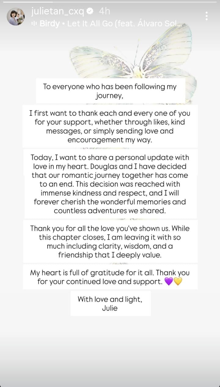 她接着透露分手消息:“今天,我带着满满的爱分享一则个人近况。Douglas和我已经决定结束彼此的恋爱旅程。这个决定是在极大的善意与尊重中做出的,我会永远珍惜我们共同拥有的美好回忆与无数历险。”