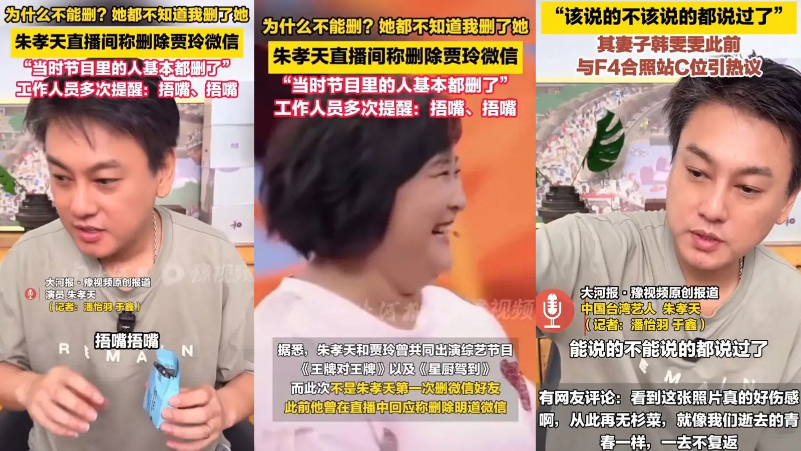(综合讯)F4成员朱孝天昨天(7日)在直播中意外自曝已删除中国喜剧天后贾玲的微信,更直言:“我为什么不能删贾玲?她都不知道我删了她,当时节目里的人都删了。”这番惊人之语让身旁工作人员急忙捂嘴阻止,却已来不及挽回这场“社交灾难”。