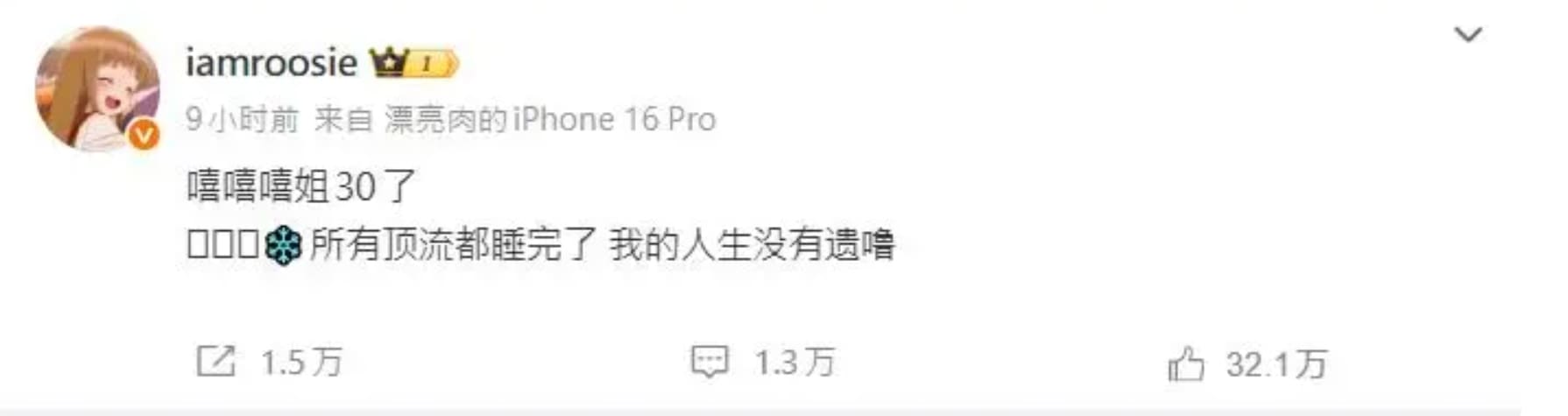 微博帐号“iamroosie”连续发文,自称已年满30岁,并以挑衅语气表示,与多名“顶流男星”有过私下接触,“所有顶流都睡完了,我的人生没有遗(憾)噜”。
