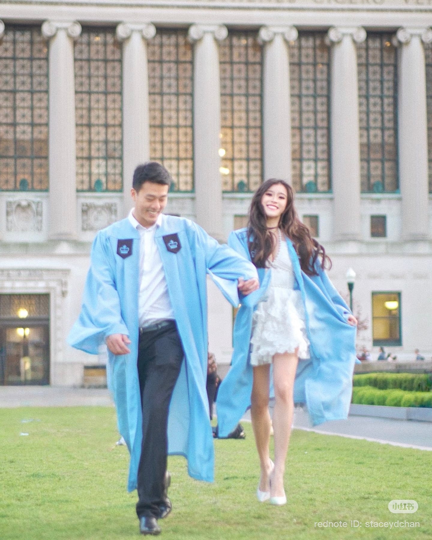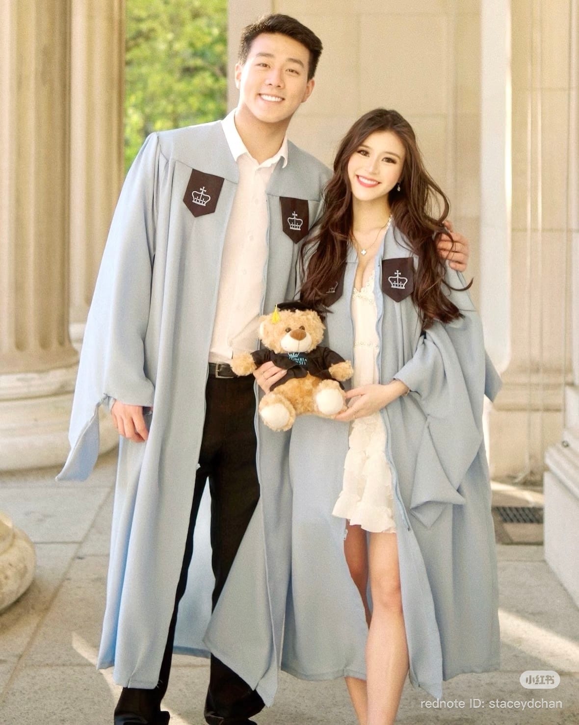 陈咏诗在小红书晒出数张两人在哥伦比亚大学校园多处拍照留念的画面,她身穿白色低胸短裙搭配蓝色毕业袍,而男友同样身穿毕业袍,有轻拥、牵手甜蜜画面。