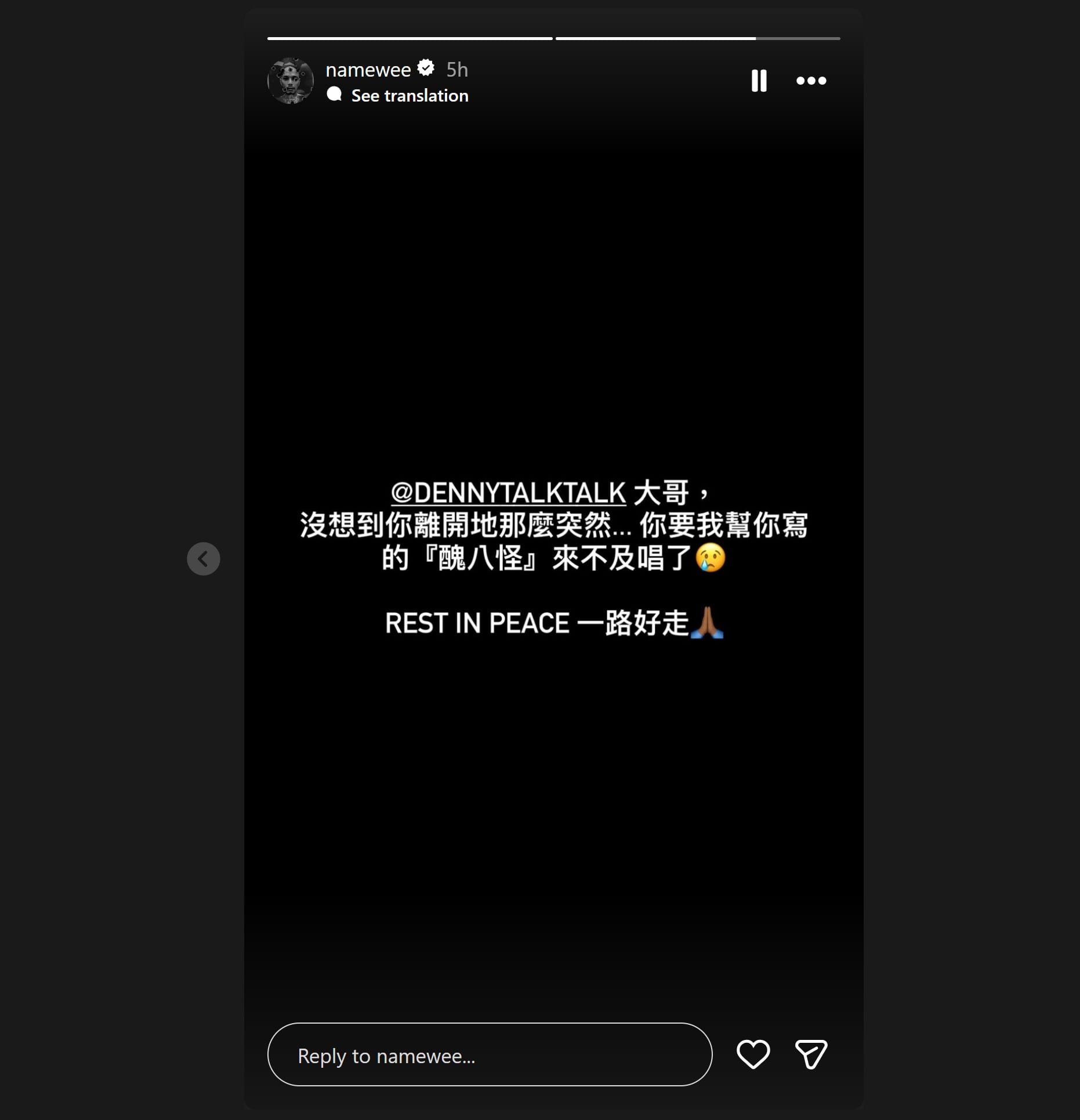 随着死讯传开,许多圈中好友纷纷哀悼。马来西亚创作鬼才黄明志今天在IG限时动态发布黑底白字文哀悼,语气中满是不舍与遗憾。黄明志透露,两人原本早有合作计画,且曹西平曾亲自向他邀歌,希望能有一首量身打造、符合他风格的代表作。