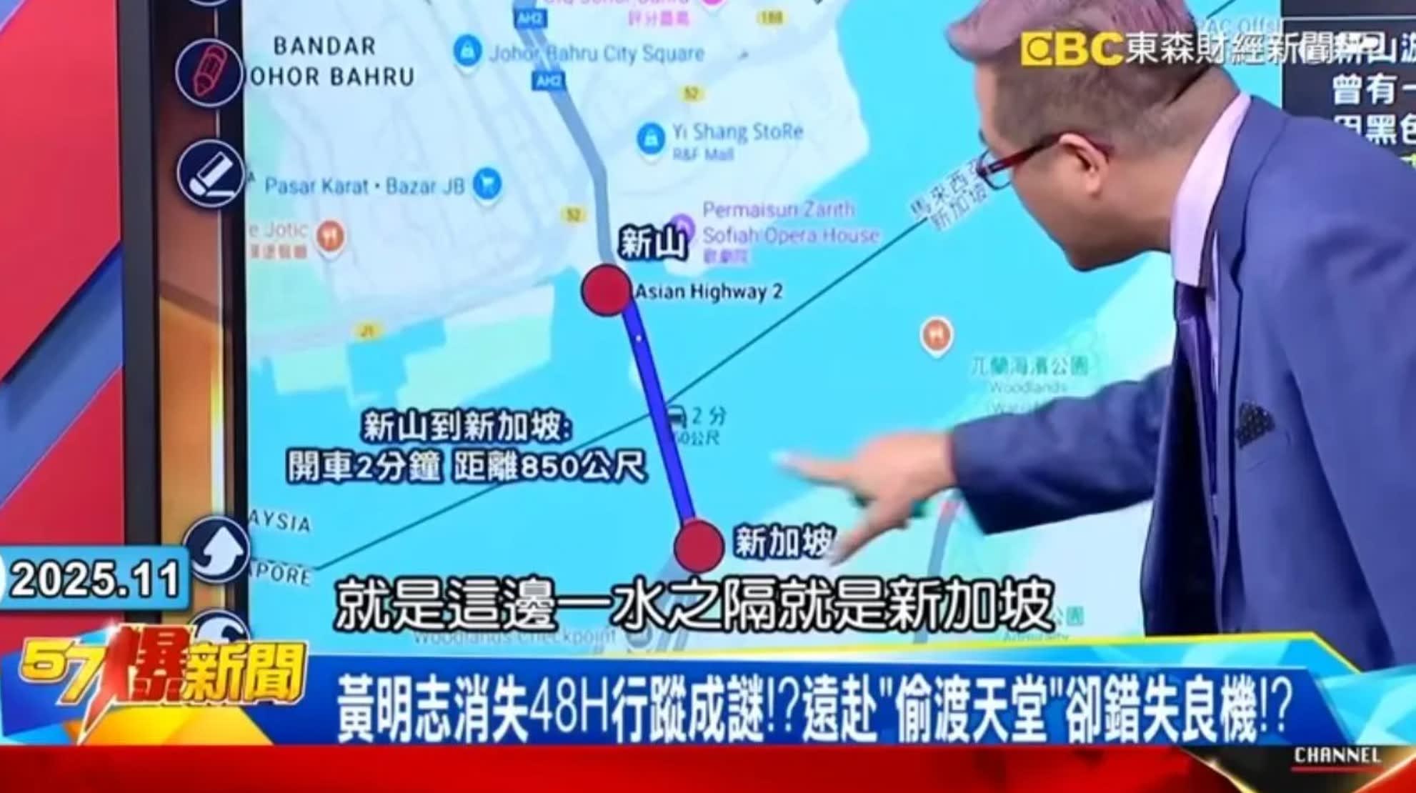 台湾节目《57爆新闻》谈论到黄明志投案前为何跑到马来西亚新山。新山邻近新加坡,从吉隆坡搭飞机到新山要50分钟、开车约4小时,难道是想潜逃?主持人也疑惑:“容易吗?”