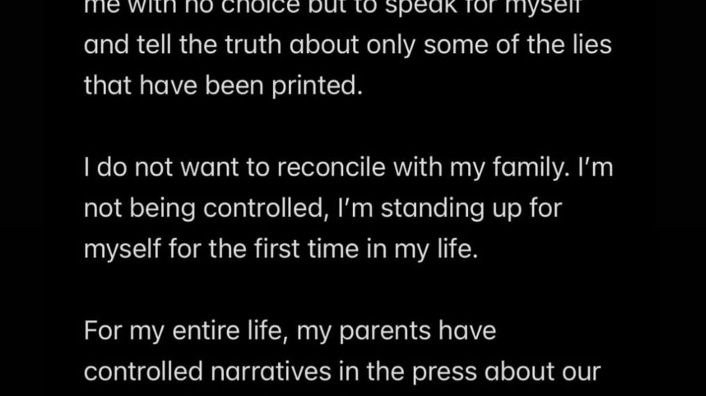 他直指,父母多年来一直在媒体上主导“完美家庭”的形象,这与他实际的成长经验相去甚远,并直曝亲眼见到父母为了维护形象,不惜在媒体上散布无数谎言,“而这些谎言往往都建立在无辜的人身上”。