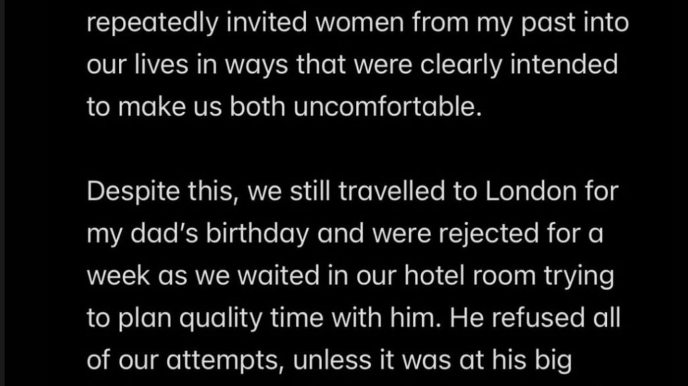 直到婚礼前一晚,家人甚至对Brooklyn Beckham表示,Nicola Peltz-Beckham“不是血亲,也不算家人”。Brooklyn Beckham继续揭露,自从为自己和Nicola Peltz-Beckham挺身而出后,“我的父母无论私下或公开,都对我发动了无止尽的攻击,并依照他们的指示把这些内容送给媒体”,连亲兄弟也被被牵扯其中。“他们被指使在社媒上攻击我,直到2025年夏天毫无预警地封锁了我”。