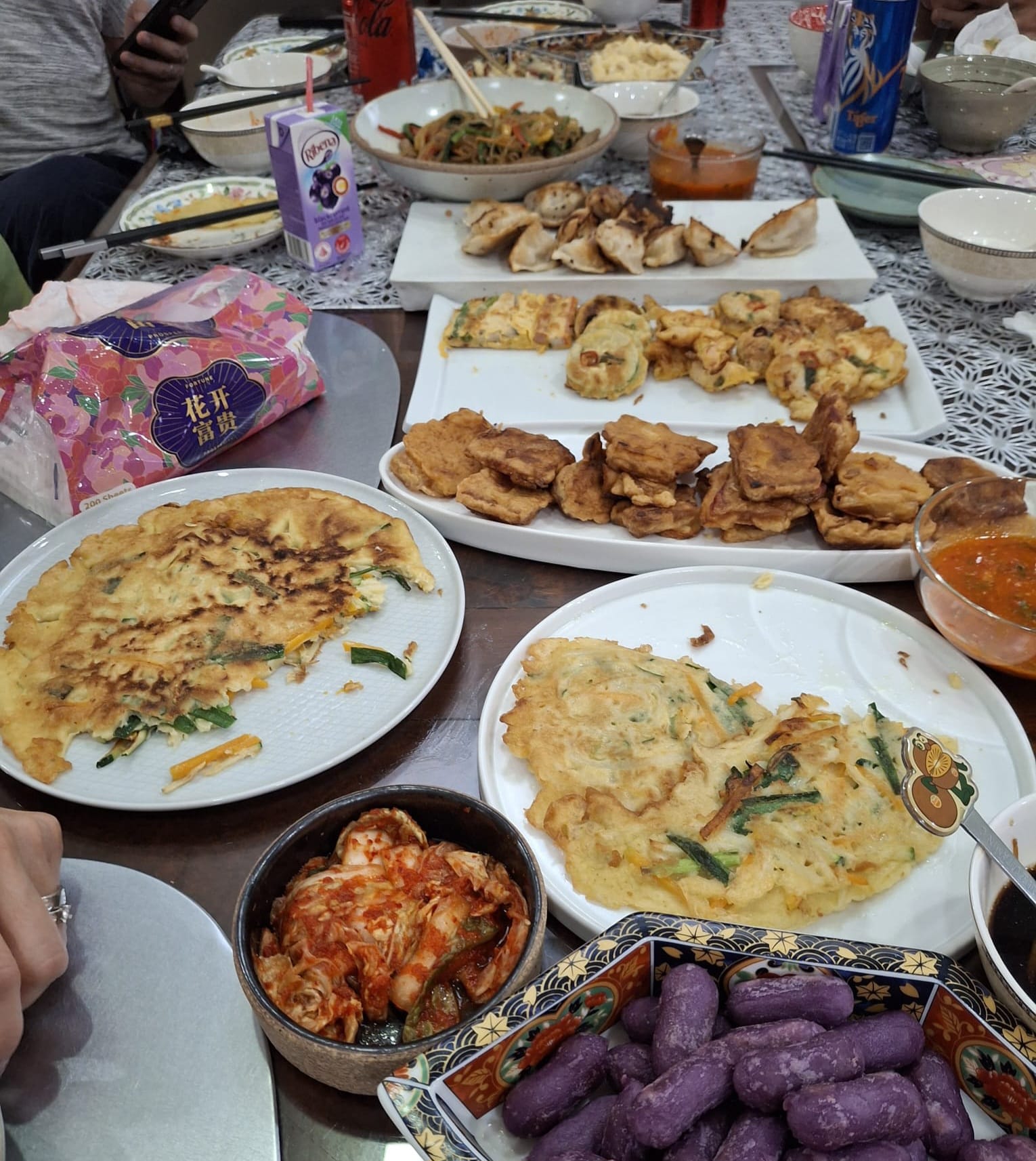 金姐今年特地下厨煎了年糕和饺子,她的韩国媳妇也帮忙下厨为贵客们准备了炒冬粉、猪肉耳朵、沙律等美食。