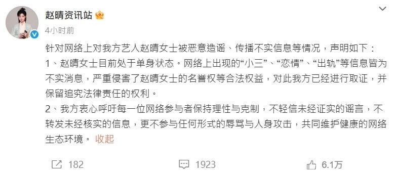 另一方面,赵晴也透过经纪公司发出声明,否认小三指控。
