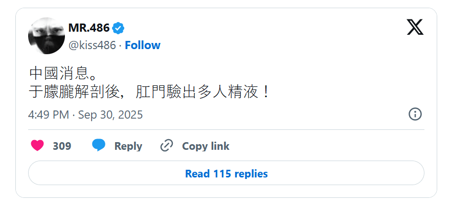 486先生发文爆料:“中国消息。于朦胧解剖后,肛门验出多人精液!”