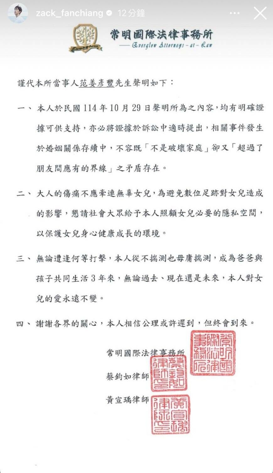 声明中也恳请外界不要牵连无辜的家人,希望能保护孩子的身心健康成长。范姜彦丰坚定表示无论过去、现在或未来,他对家人的爱永远不变,并相信“公理或许迟到,但终会到来”,让这场备受瞩目的感情纠纷再添法律战的火药味。