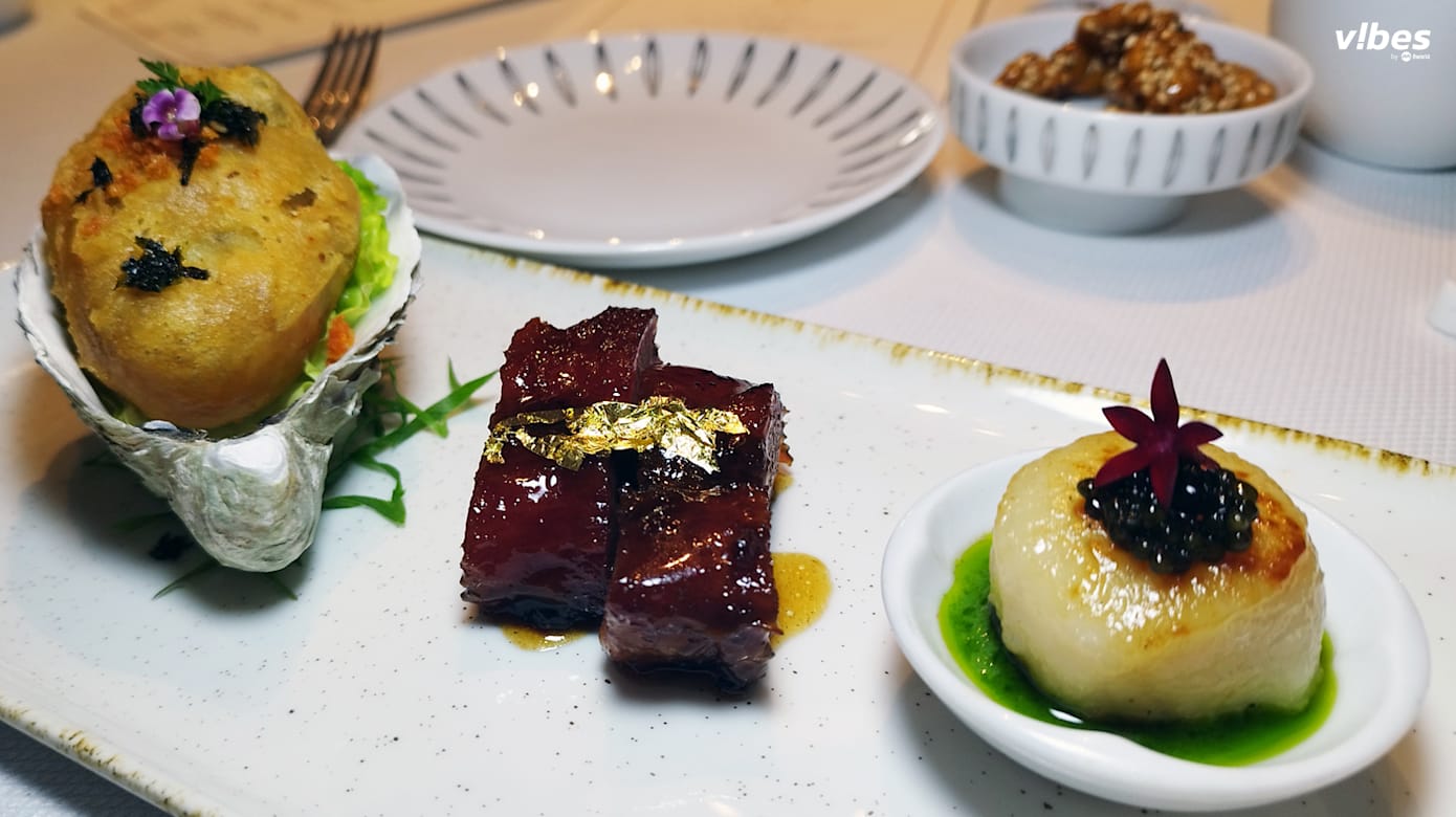 在进入主菜前,先品尝“发财拼盘”($42/单人)——海苔香酥法国生蚝外皮酥脆,内里的生蚝饱满多汁,毫无腥味;传统炭烧西班牙黑豚肉叉烧甜咸适中,带有淡淡炭香,肥瘦相间,口感弹牙;而香葱藤椒煎元贝虽不及前两道惊艳,但淡淡的藤椒香气为整体风味增添了平衡感。