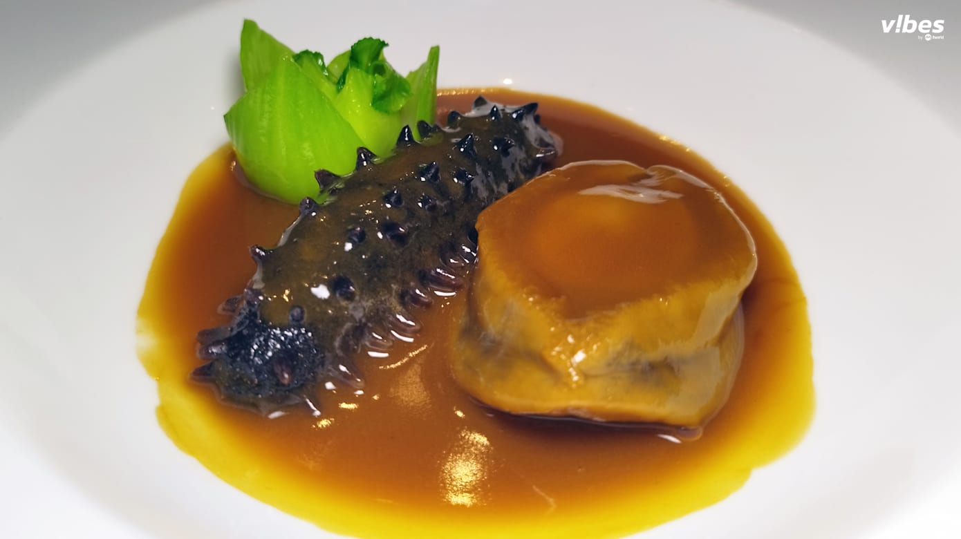 鲍鱼配海参是粤菜的经典搭配。这道蚝皇香扣四头南非鲍鱼伴日本关东辽参($98/单人),选用了整颗四头南非鲍鱼与日本关东辽参,以传统焖煮方式烹制,突出食材本味与醇厚蚝香。