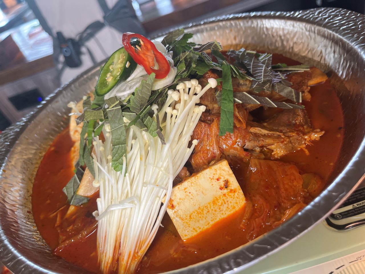 一整棵大白菜泡菜和排骨入锅慢炖,排骨和泡菜都很软嫩、还有配料如金针菇、豆腐,每一口都能喝出吸收食材精华的汤汁。