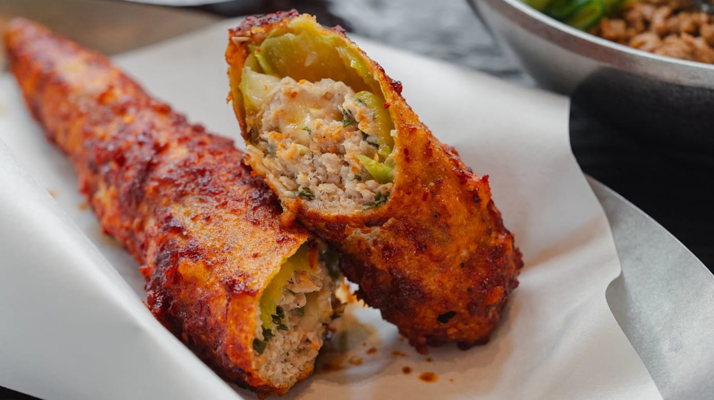 这是一道在韩国传统市场中高人气的美食。香炸酥脆的青椒中,酿入猪肉末、豆腐和多种蔬菜的馅料,口感层次有风味。爱吃辣的你,也可选择涂抹一层韩式辣酱。