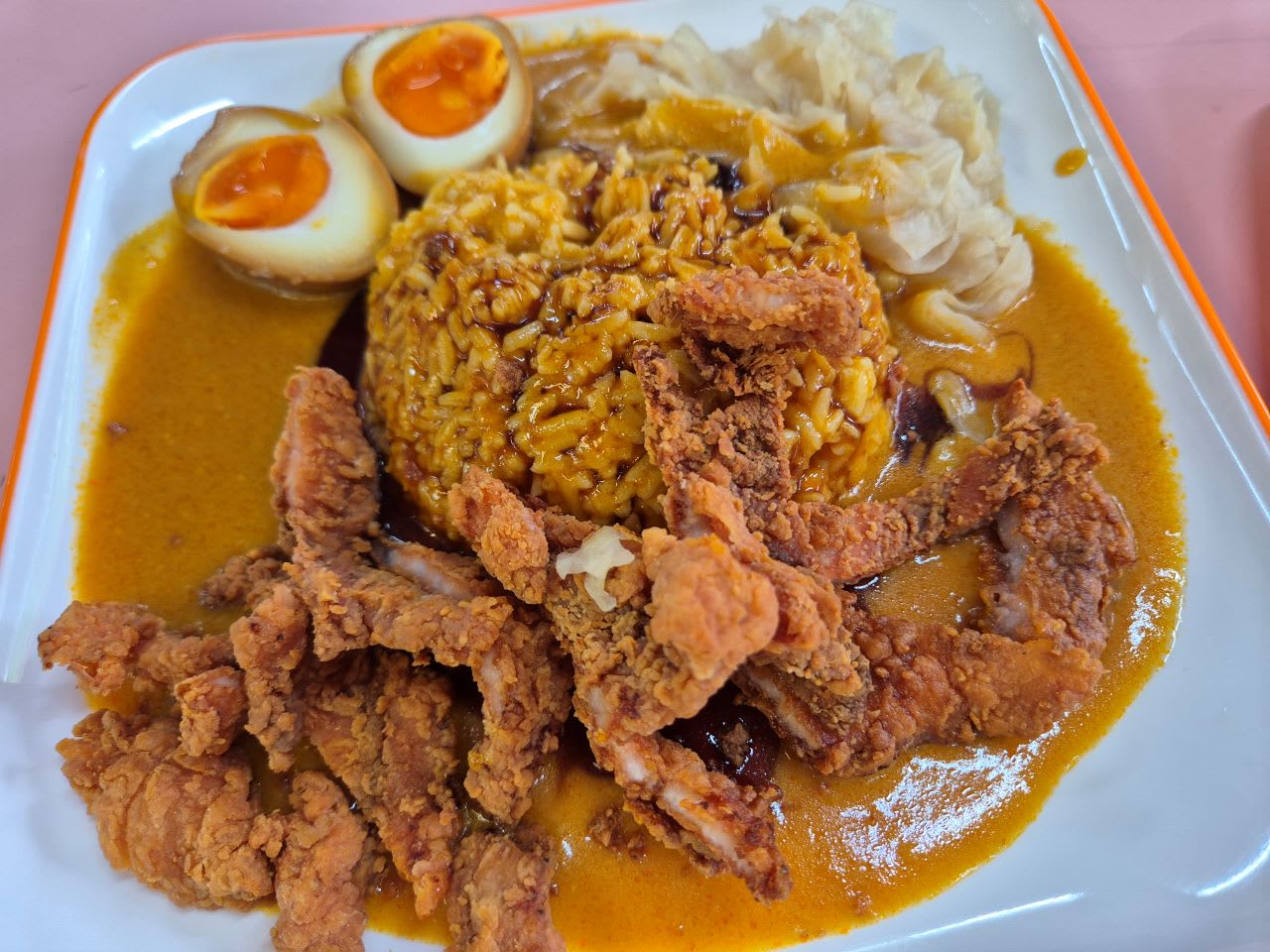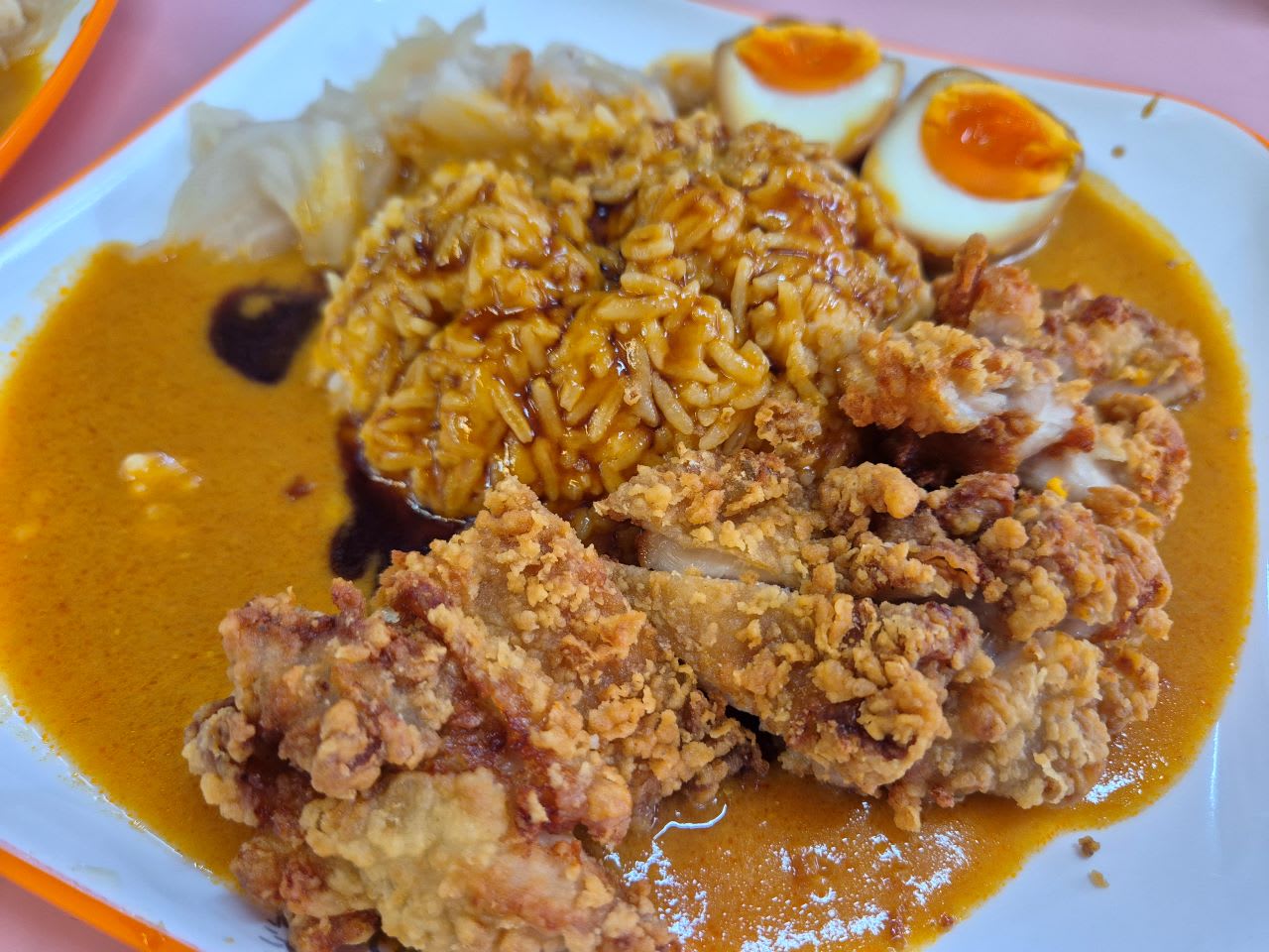 “Dragon Curry”一份咖喱饭($5起),包括白饭和包菜,淋上咖喱和卤汁,搭配溏心蛋,以及“主角”:招牌炸鸡扒($5)、南乳三层肉扒($5.90)、叁巴虾($6.90)、炸罗非鱼($6.90)、卤肉($5.90)或炸sotong($8.90)。