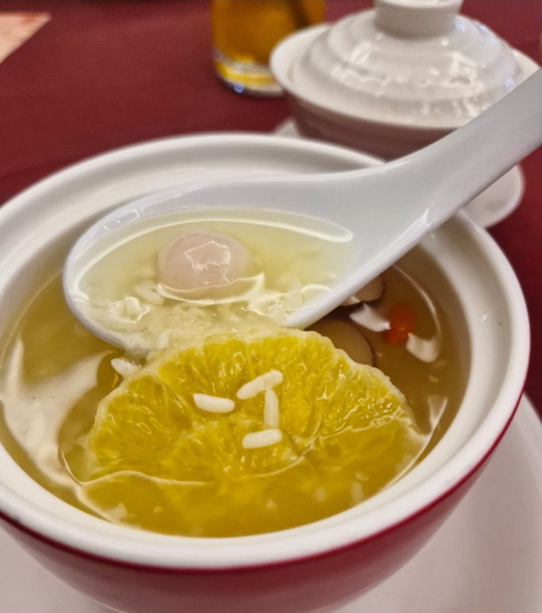 这道甜品如同一阵和煦的春风,温润得燕窝细滑入喉,糯米小丸子透着淡淡酒香,橙片的清甜隐约其中。喝上一口,身心俱暖,为这场团圆宴画上一个贵气而舒心的句点。