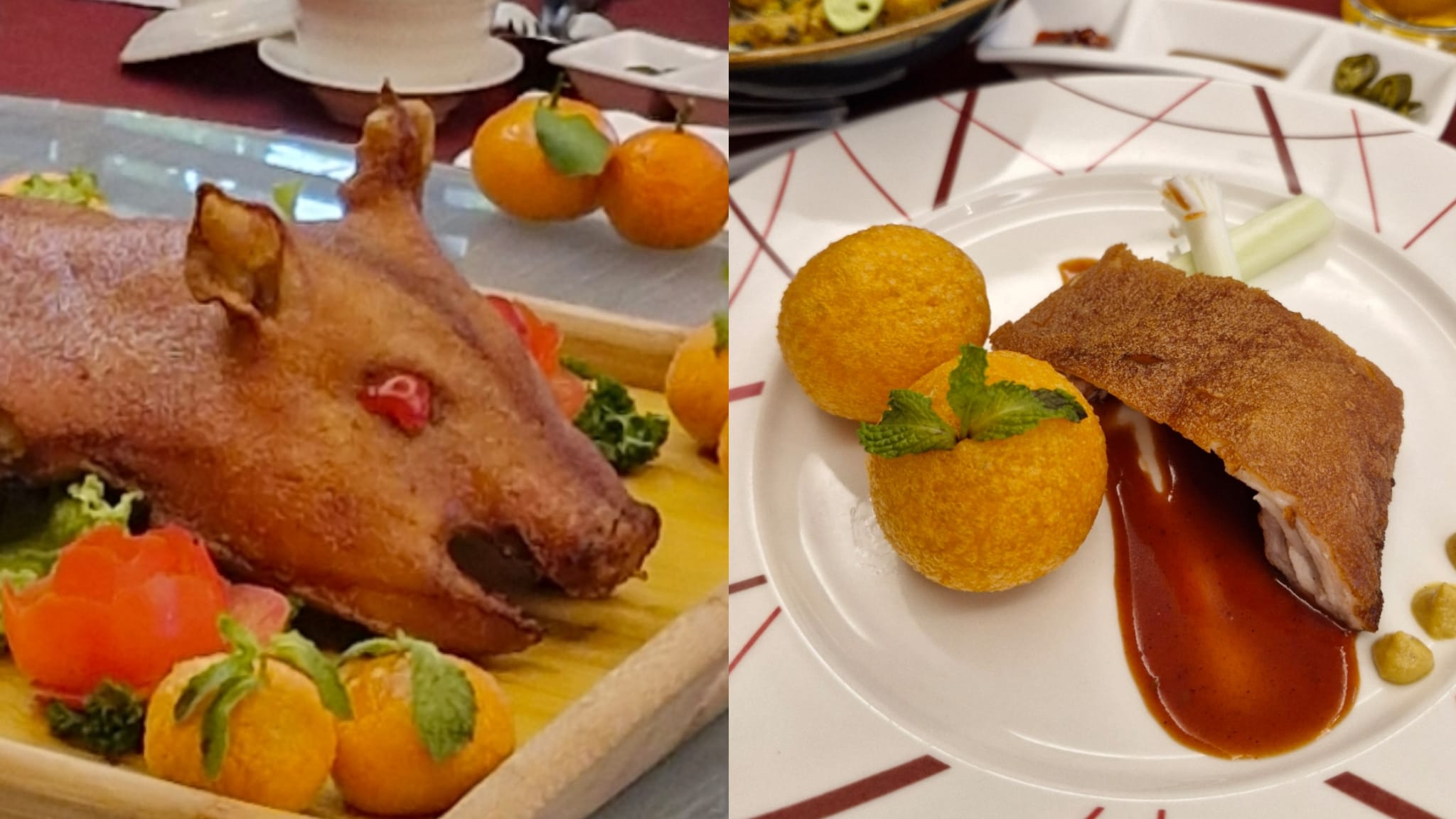 这是足以引爆全场视觉的“重头戏”。金猪得外皮被烤制得如琥珀般透亮,在灯光下闪烁着诱人的油脂光泽。当服务员一刀切下时,那“咔嚓”一声脆响,是年味最生动的呈现。