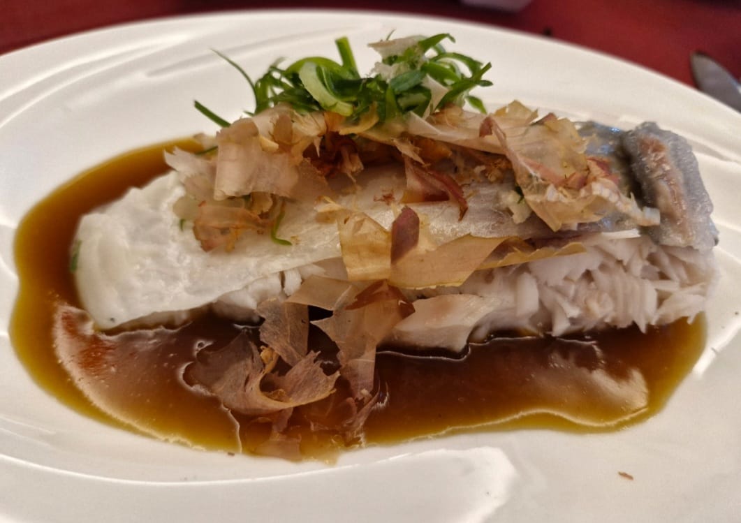 清蒸:服务员在桌边利落地去鳞切块,鱼肉洁白如雪,淋上秘制鲍汁,每一口都是最原始、最纯粹的深海鲜甜,细嫩得几乎不需咀嚼。