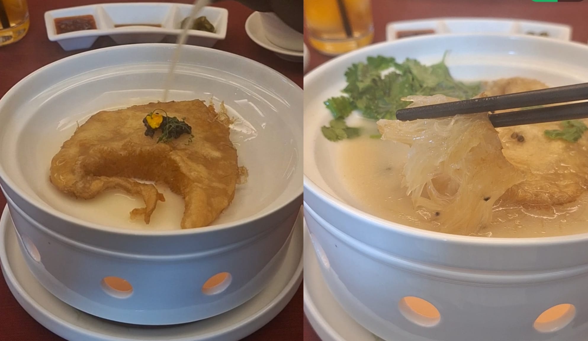 一大片鲍翅吸饱了慢火熬制的翅骨浓汤,汤色醇厚,大鲍翅入口先是牙齿轻触的清响,随即而来的是胶质丰盈的柔滑与鲜甜,暖意从舌尖直抵心间。