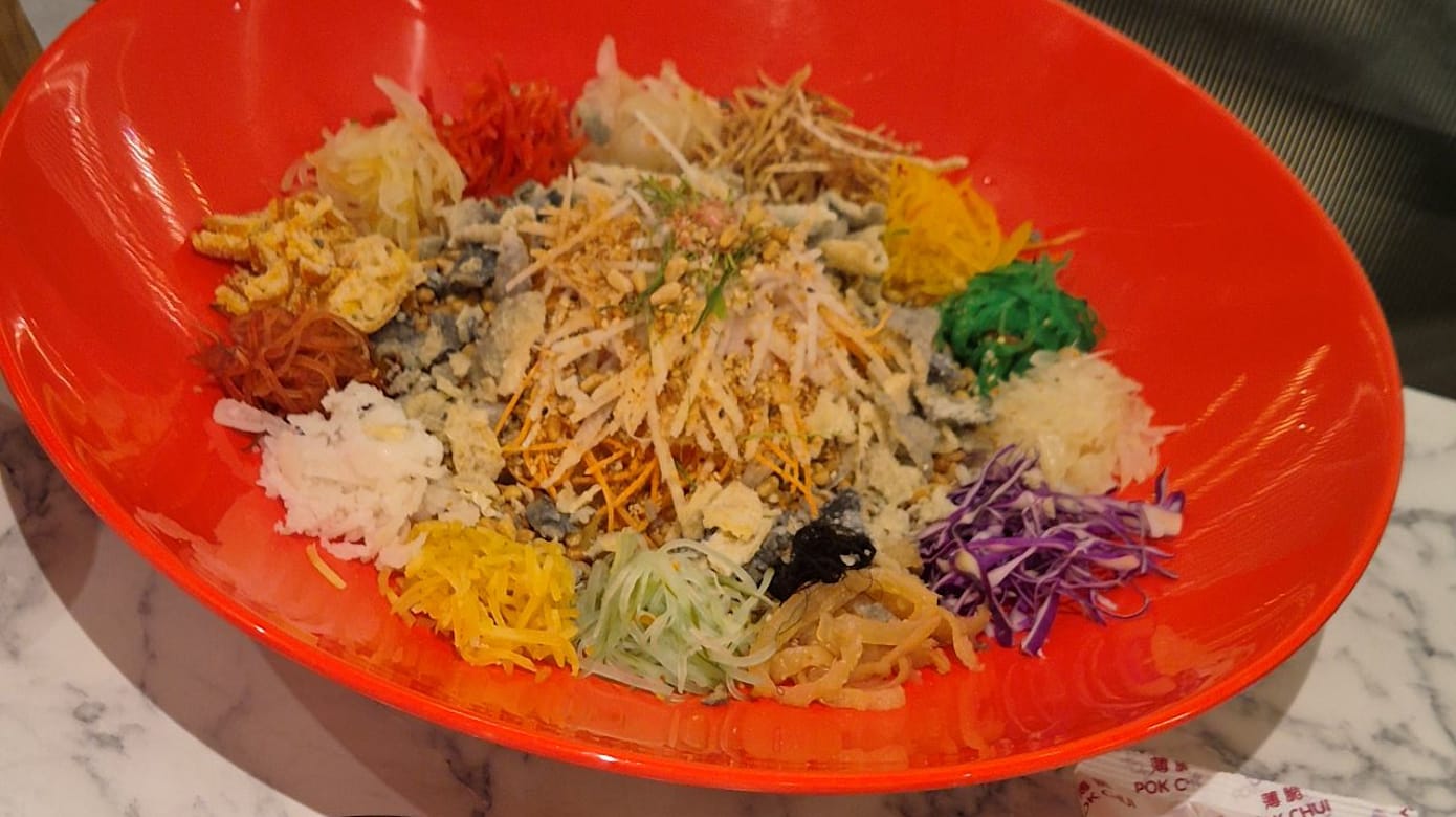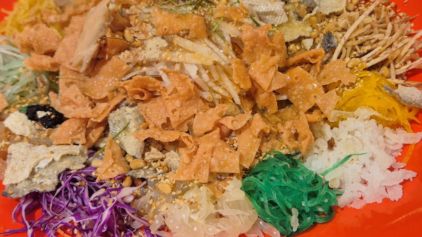 捞鱼生之前,餐馆员工会先表演一段歌舞热闹开场!主打橄榄油呈现健康风味,搭配厚实有咬劲的鲍鱼、各式五彩蔬菜、柚子、坚果、芝麻、炸鱼皮等,酸甜开胃,为一系列丰盛年菜掀开序幕!
