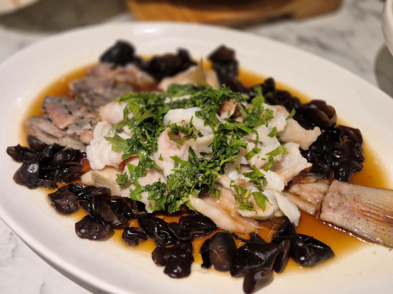 有别于一般经典港蒸方式,这道蒸红斑,加入云耳、撒上芹菜,从香气、口感上再升华!鲜嫩鱼肉,搭配爽脆云耳,传统风味中带有家常养生的feel,就像是山珍海味中的一股“清流”。