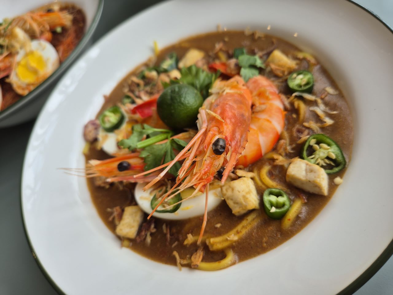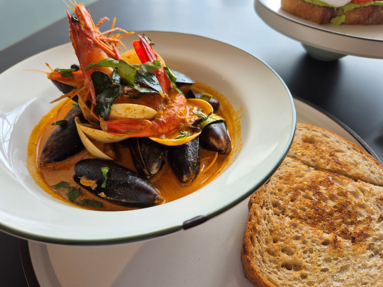 由淡菜、蛤蜊、鲜虾、laksa叶、青柠叶等煮出的laksa汤汁,咸香辣之中多一层浓郁鲜美滋味。搭配烤至香脆的酸种面包,完美结合意式和本地风味,惊艳味蕾。