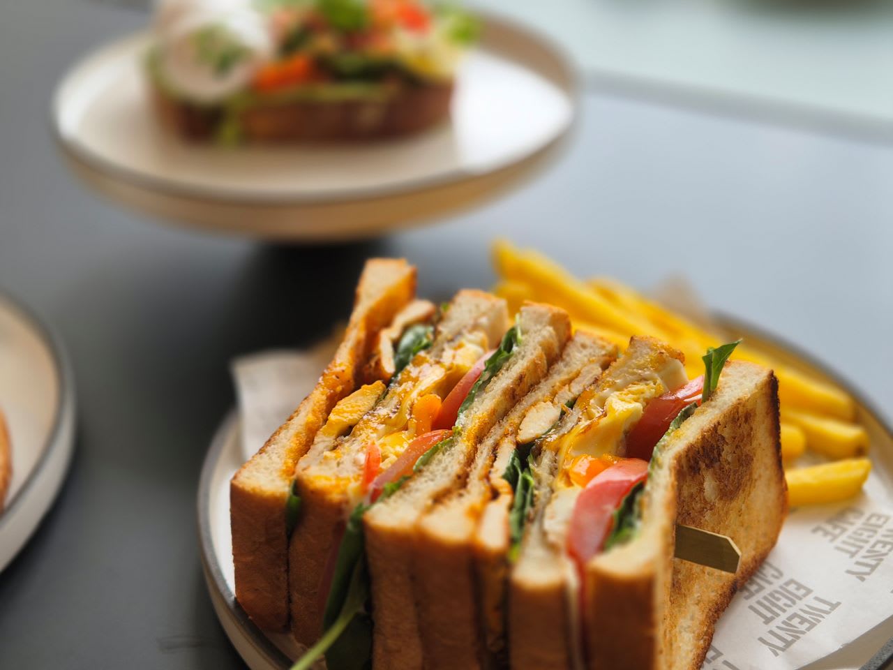 带盖吐司(Pullman bread),夹上甜椒风味的鸡胸肉、芝士、鸡蛋、嫩菠菜、番茄,加上烤芝麻美乃滋,搭配薯条,得要大口吃下的每一口满是料!